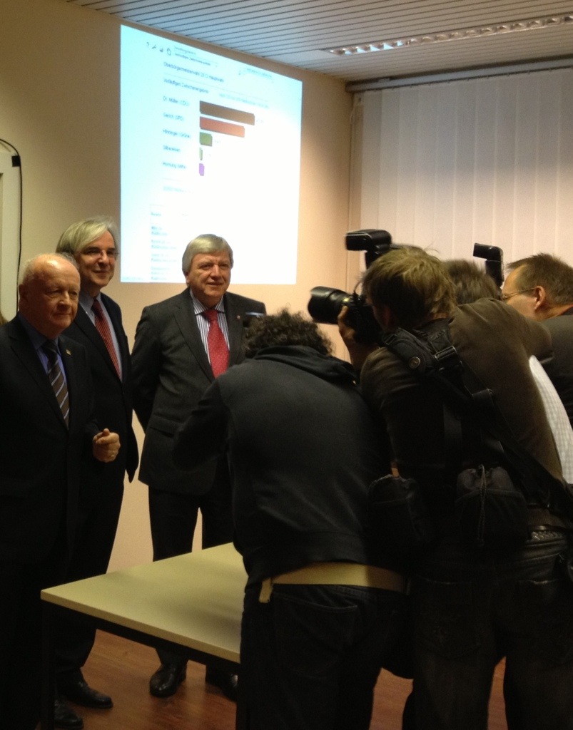 Im 3. Stock des Rathauses, Raum 301 der CDU-Fraktion, tritt um 19.05 Uhr der amtierende OB Dr. Helmut Müller mit dem CDU-Landesvorsitzenden und Ministerpräsidenten Volker Bouffier und dem CDU-Kreisvorsitzenden Horst Klee vor die Presse.