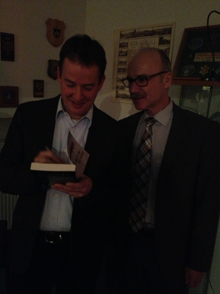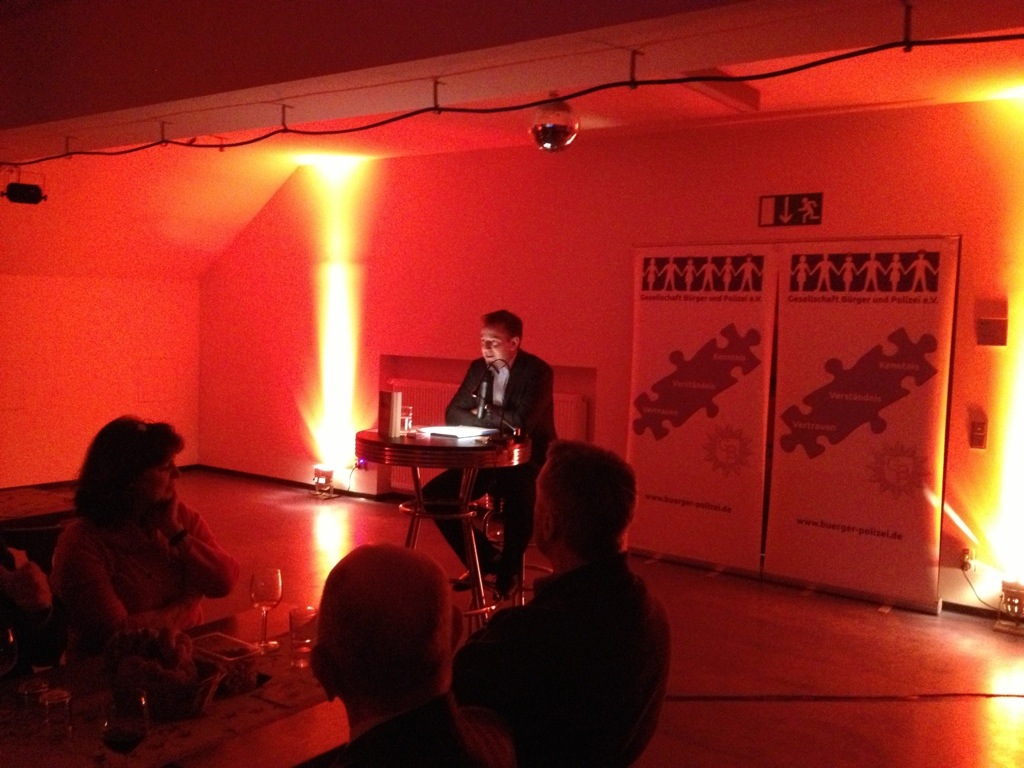 Andreas Wagner (39, Winzer mit Dr. in Geschichte) liest heute Abend aus seinem Werk „Hochzeitswein“ (seinem 5. Krimi). Eingeladen hat die Gesellschaft Bürger & Polizei Wiesbaden, die Location ist exklusiv: Der 3. Stock des Polizeipräsidiums. Die Reihen sind voll besetzt.