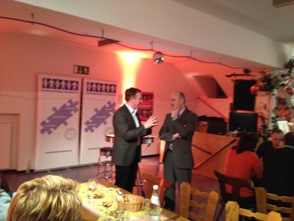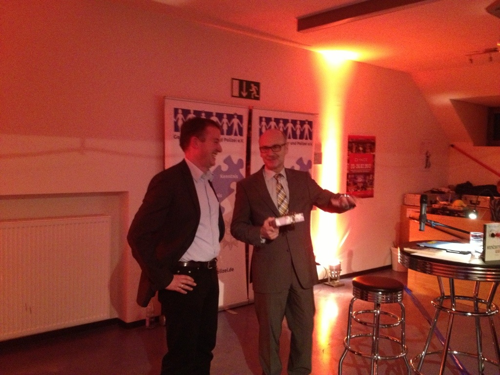Polizeipräsident Robert Schäfer (in Personalunion einer der beiden Vorstände der Gesellschaft Bürger & Polizei) begrüßt schmunzelnd: „Jetzt wird es schwierig: Alkohol und Kriminalität bekämpfen wir jeden Tag.“ Trotzdem öffnet Winzer-Krimiautor Wagner die ersten Flaschen.