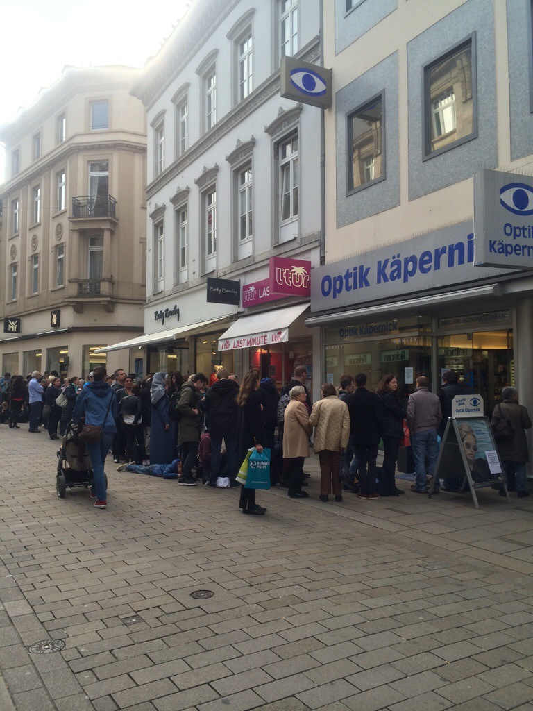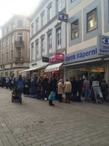 Wiesbaden, 19. März 2015 – Ansturm nachmittags in der City auf ein Brillengeschäft in der Fußgängerzone: Hunderte Wiesbadener wollen sich noch rechtzeitig für die für morgen vorhergesagte Sonnenfinsternis mit Spezialbrillen ausstatten. Der Optiker in der Langgasse hatte für heute ab 15 Uhr den Spezialbrillenverkauf auf seiner Internetseite für 10 Euro pro Stück angekündigt. Der Wiesbadener Diplom-Meteorologe Dominik Jung von wetter.net erklärt die Sonnenfinsternis: „Bei einer Sonnenfinsternis schiebt sich der Mond zwischen Erde und Sonne.