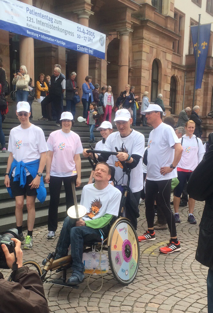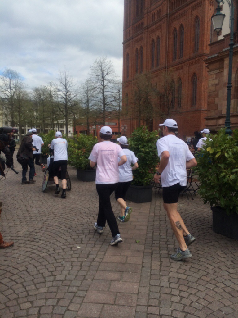 Wiesbaden, 11. April 2015 – Der bundesweite Fackellauf für Inklusion ist heute um 13 Uhr vor dem Rathaus gestartet. Oberbürgermeister Sven Gerich (SPD) übergab an der Rathaustreppe die Fackel an Stephan Vokuhl und Stan Albers, dann spurteten die beiden mit weiteren Läufern los.