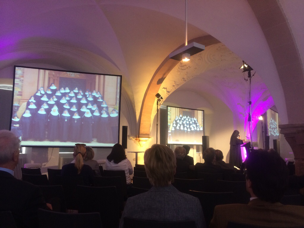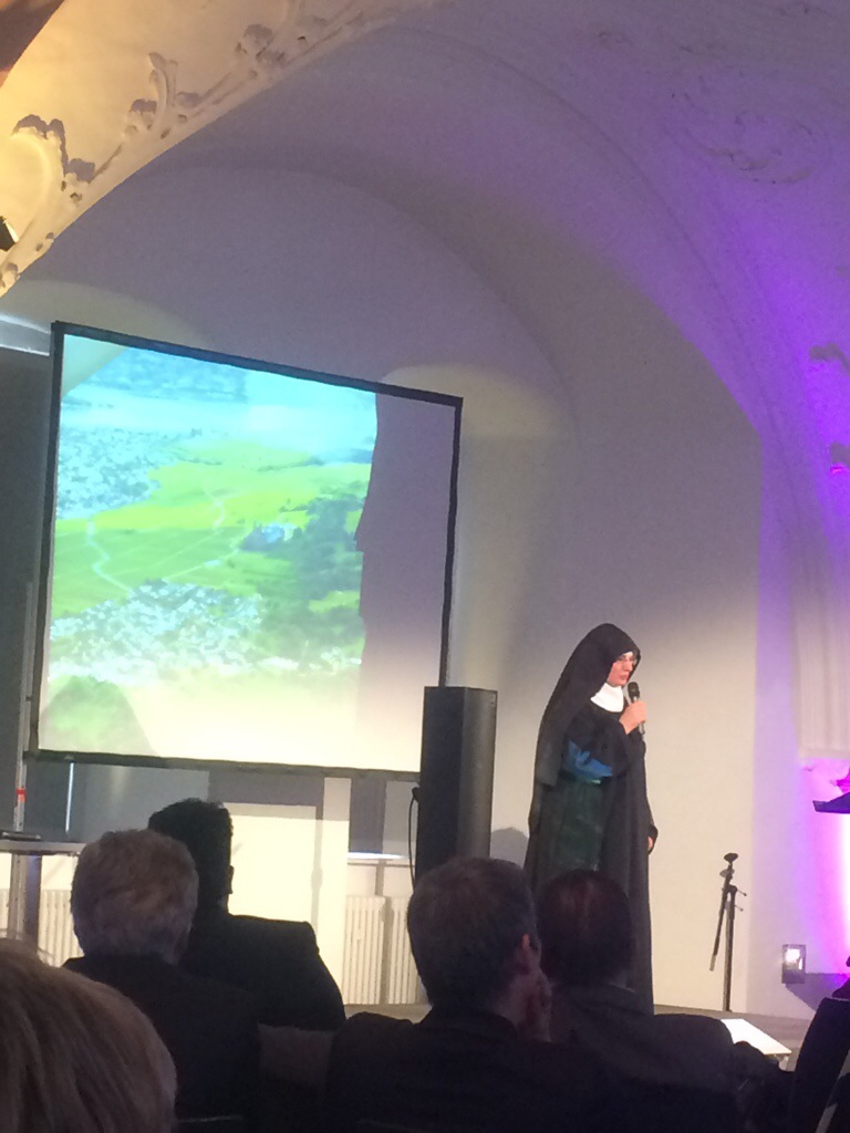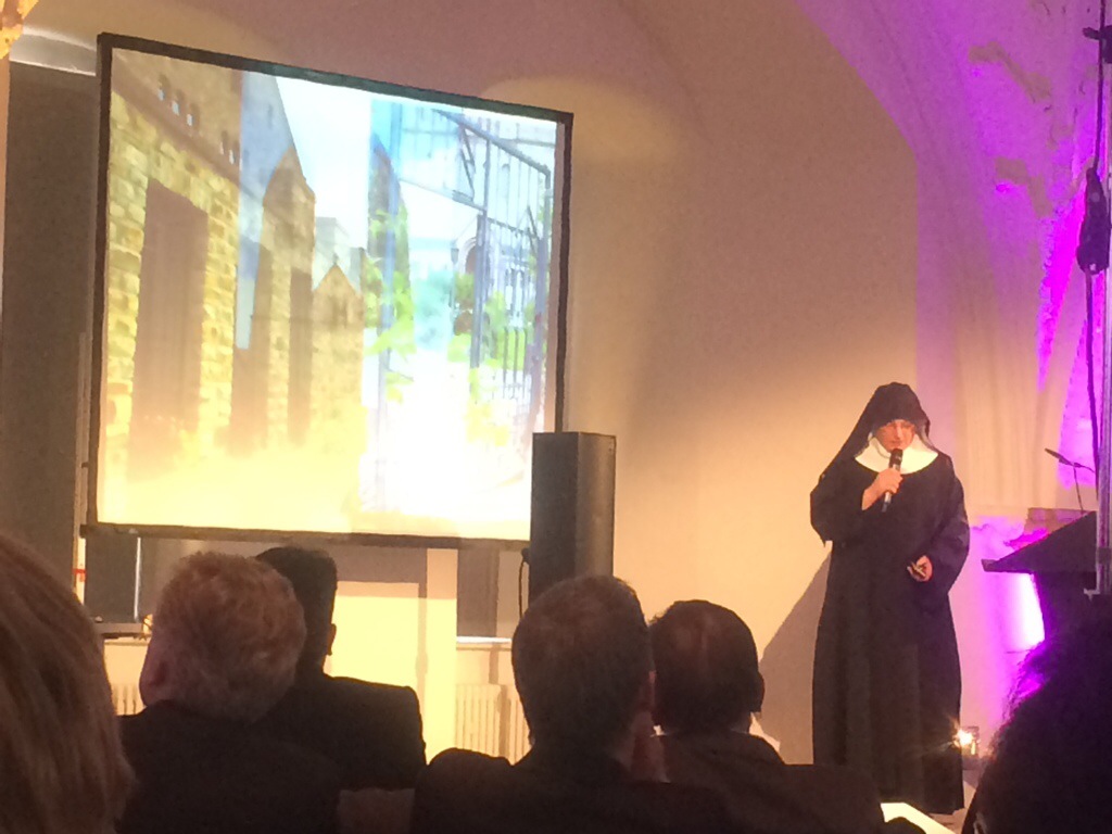 Im Anschluss gab’s Kontrastprogramm: Es sprach Schwester Thekla vom Kloster Eibingen. Sie klärte die Zuhörer über das Klosterleben auf (5 mal am Tag beten, Gregorianischen Choral auf Latein singen, leben in einer Zelle, rechtlich ist das Kloster ein eingetragener Verein). Dann kam die Überraschung: „Eine Mitschwester ist Goldschmiedin und hat schon mal der