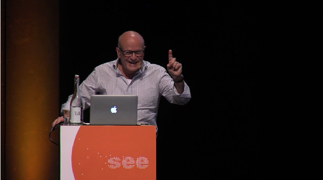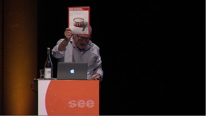Wiesbaden, 18. April 2015 – Volker Schlöndorff, geboren am 31. März 1939 in Wiesbaden ist in seine Heimatstadt zurückgekehrt, um heute bei der Design-Konferenz „see-Conference“ auf dem Schlachthofgelände am Bahnhof zu sprechen. Nach seiner Anreise gestern und einem gemütlichen Beisammensein mit den Konferenz-Veranstaltern im Restaurant Bobbeschänkelche, sprach er heute auf der Bühne über die Kraft der Bilder und erklärte die Symbolik im Buch „Die Blechtrommel“ seines kürzlich verstorbenen Freundes und Autors Günter Grass.
