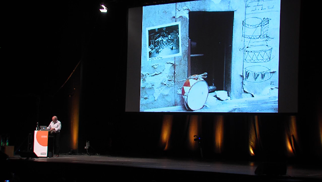 Dann spricht Schlöndorff über eine ganz besondere Bilder-Symbolik: Die Blechtrommel aus dem gleichnamigen Roman von Günter Grass, den Schlöndorff 1979 verfilmte und mit dem ihm der internationale Durchbruch gelang: „Diese Blechtrommel, das Spielzeug, gibt es in keinem Spielzeuggeschäft. Ich weiß das, weil wir versucht haben für den Film eine zu bekommen. Wir mussten sie bauen lassen.