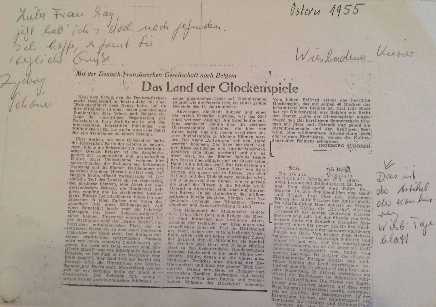 Für ein halbes Jahr gab es nach dem Krieg erst mal keine Schule „dann haben wir ein Brikett mitgebracht und erste Aufgaben bekommen. Für uns Kinder war das ein Abenteuer.“ Ingeborg Schöners Vater Eduard war im Krieg an Flecktyphus verstorben, sie lebte mit Ihrer Mutter Charlotte und dem sieben Jahre jüngeren Bruder Helmut zu dritt in einer Wohnung: „Wir hatten drei Zimmer und mussten zwei davon vermieten. Da zog in ein Zimmer der Dr. Hans Kloos vom Feuilleton des Wiesbadener Kuriers ein. Da war ich etwa 12 Jahre alt. Er hatte immer die neuesten Bücher zur Besprechung und ich durfte sie lesen. Und am Abend sagte er oft ‚und welche der Damen kommt jetzt mit mir ins Theater?‘ und ich durfte dann mitgehen in die Oper und mit Dr. Kloos 2. Reihe Mitte sitzen, wenn er Aufführungen ansah, um darüber Kritiken zu schreiben. Carmen, die Meistersinger, es war wunderbar.“ Und dann wurde sie selbst zur „Redakteurin“: „Es gab eine Studienfahrt der Deutsch-Französischen Gesellschaft nach Belgien und Dr. Kloos ließ mich dort mitfahren mit meiner Mutter. Da standen also alle da vor der Abfahrt, auch ein älterer Herr vom Tagblatt. Und alle warteten auf den Redakteur des Kuriers. Bis ich dann sagte – ‚das bin ich!‘. Das konnten die Herren gar nicht fassen“. Geschrieben hat sie den Artikel dann doch „Ich war damals noch sehr jung, der Artikel hieß ‚Im Land des Glockenspiels‘, es war eine tolle Reise – ich war seitdem nie wieder da.“ Der Artikel wurde im Wiesbadener Kurier abgedruckt – und Ingeborg Schöner hat ihn bis heute aufbewahrt.