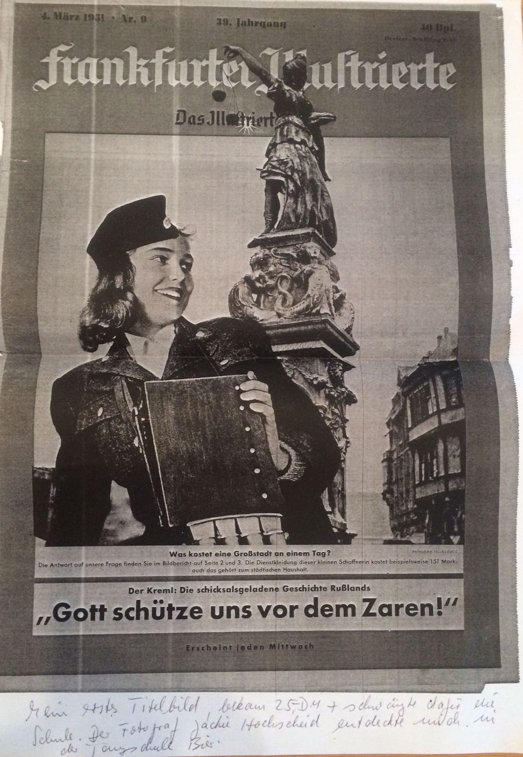 Wie ihre Erinnerungen an die Tanzschule Bier, wo man sie für die ersten Modeaufnahmen entdeckte: „In der Tanzschule Bier konnte man sonntags für eine Mark drei Stunden tanzen. Meine Mutter hat mir das erlaubt, sie war sehr großzügig. Dann kam eines Tages ein Fotograf einer Frankfurter Illustrierten und machte Fotos wie wir tanzten. Er fragte mich, ob ich Zeit hätte, es sollte eine Schaffnerin fotografiert werden, ich sollte 25 Mark dafür bekommen. Also wurde ich dort in Frankfurt unter der Waage der Justitia fotografiert – die Uniform der Schaffnerin war mir viel zu groß und wurde ausgestopft.“