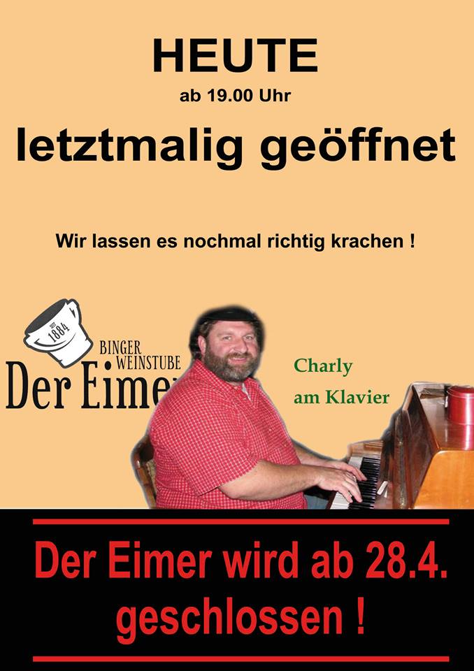 Heute Abend, von 20 Uhr bis etwa 1 Uhr nachts, wird Charly Nägler für die Gäste zum letzten Mal im Eimer am Klavier (wie immer nach Wunsch) spielen: Querbeet von Schunkelliedern, bis Operette, Schlager oder Modernes. Es gelten die alten „Eimer“-Regeln: Eintritt frei, nur Barzahlung, ein paar kleine kalte Speisen kann man haben, wenn der Hunger zwickt.