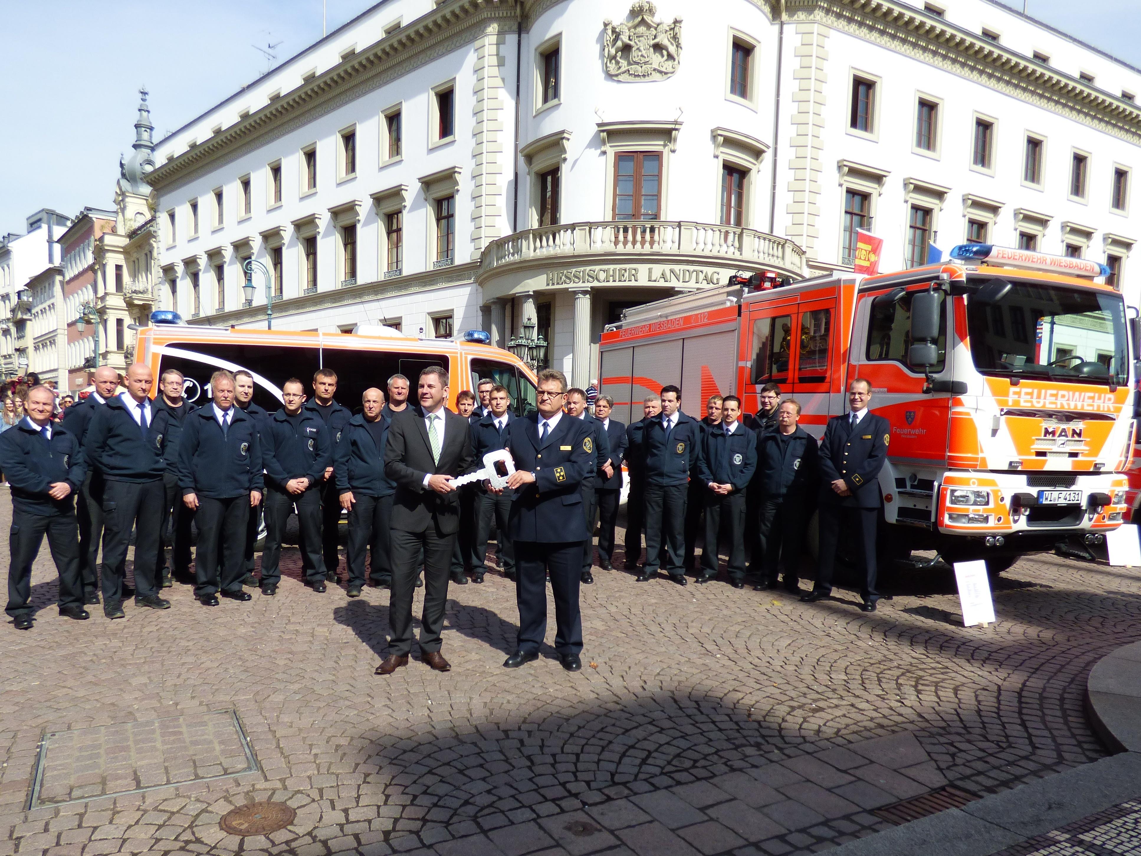 Wiesbadens Oberbürgermeister Sven Gerich (SPD, l.) mit Harald Müller, Leiter der Berufsfeuerwehr Wiesbaden und seiner Mannschaft bei der feierlichen Fahrzeug-Übergabe. Foto: Stadt Wiesbaden