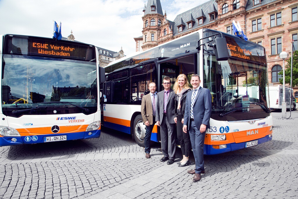 Wiesbaden, 6. Mai 2015 – 6 Millionen Euro Wert, glänzender Lack, über 300 PS: Der Frühling ist da und ESWE Verkehr hat seine Busflotte (gesamt 204 Busse) mit 22 frischen Fahrzeugen verjüngt. Davon 11 Gelenkbusse von MAN und 11 Solowagen in „Low-Entry“-Bauweise (das sind die mit dem stufenlosen Einstieg) von der Firma EvoBus.