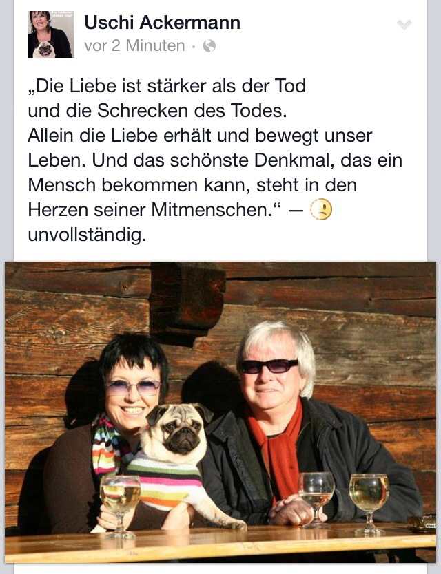 Wiesbaden, 23. Mai 2015 – Freunde trauern um den beliebten Promi-Gastronomen Gerd Käfer. Er verstarb mit 82 Jahren in der Nacht in seiner Wohnung in München an seinem Krebsleiden, die Münchner Abendzeitung hatte darüber als erste berichtet. Seine Ehefrau Uschi Ackermann sendete heute auf Facebook eine Nachricht mit dem Emoticon „unvollständig“: „Die Liebe ist stärker als der Tod und die Schrecken des Todes. Allein die Liebe erhält und bewegt unser Leben. Und das schönste Denkmal, das ein Mensch bekommen kann, steht in den Herzen seiner Mitmenschen.“ Gerd Käfer hatte mit seiner Uschi lange auch in Wiesbaden ein Zuhause, kochte in seiner 300 Quadratmeter-Wohnung „Villa Concordia“ für Freunde und Promis wie Ex-Ministerpräsident Roland Koch.