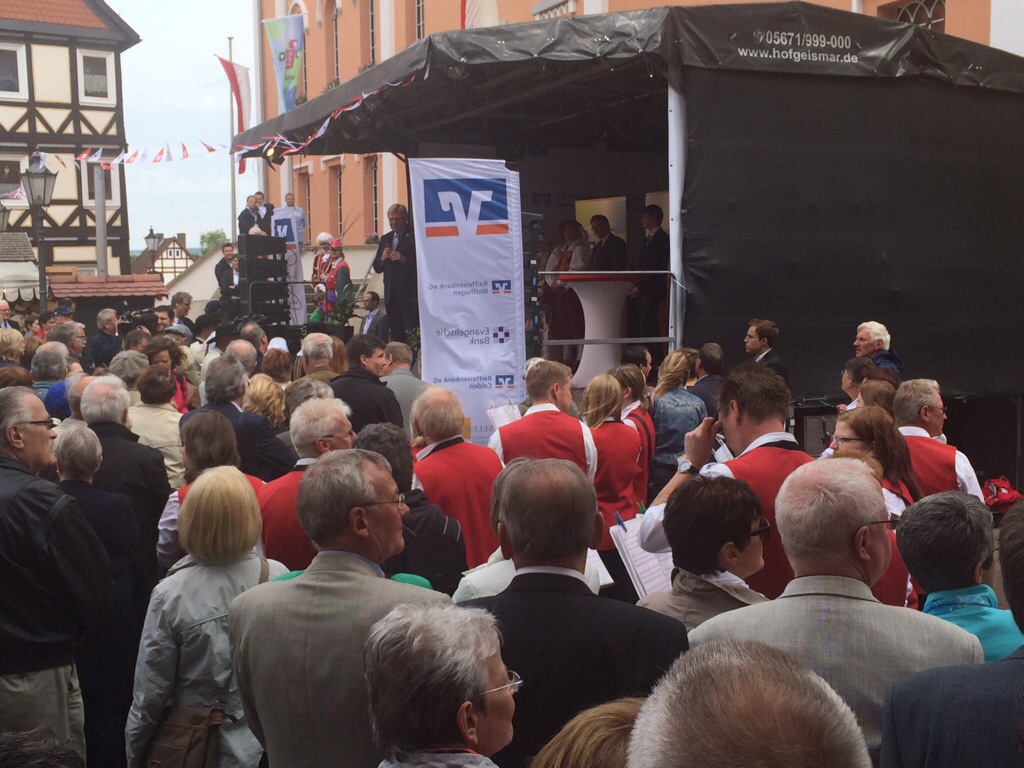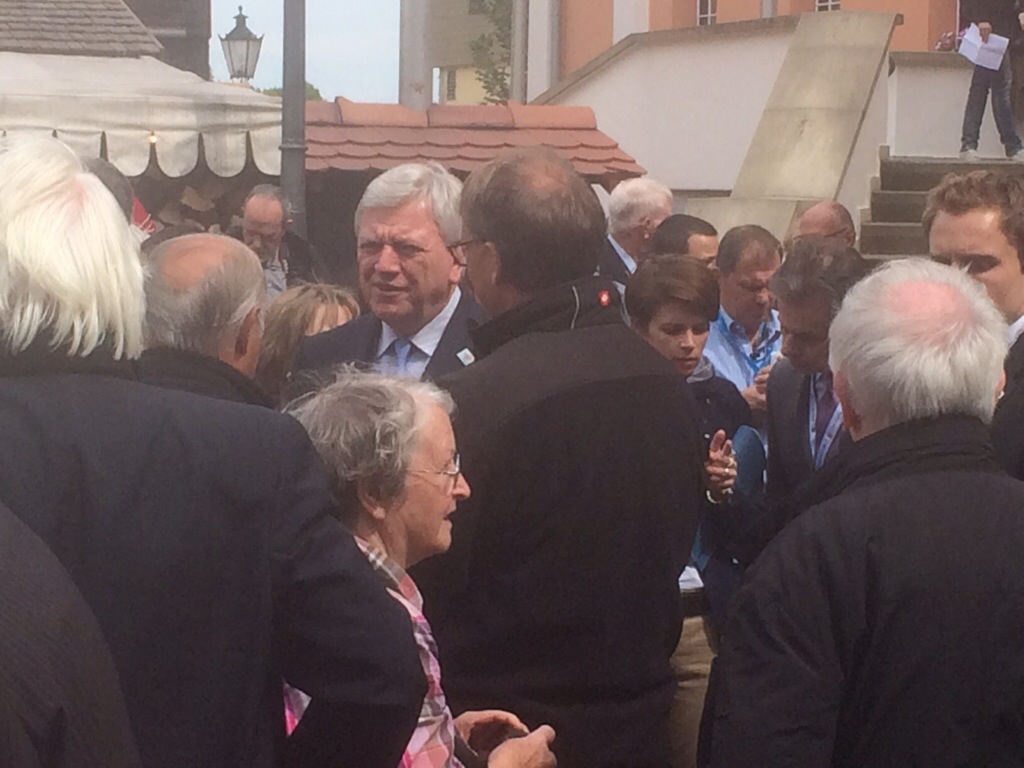Wiesbaden/Hofgeismar, 29. Mai 2015 – Pünktlich um 14.30 Uhr eröffnete heute Ministerpräsident Volker Bouffier (CDU) mit Blasmusik, Hessentagspaar, Bürgermeister und Ansprache den Hessentag in Hofgeismar. Bouffier lobte auf der Bühne das „Fest der Begegnung für alle Bürgerinnen und Bürger“, schüttelte dann viele Hände, darunter auch die einiger Wiesbadener, die zum Auftakt gekommen waren.