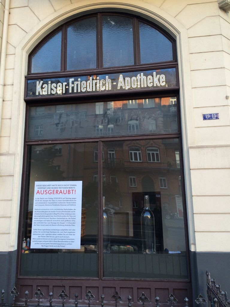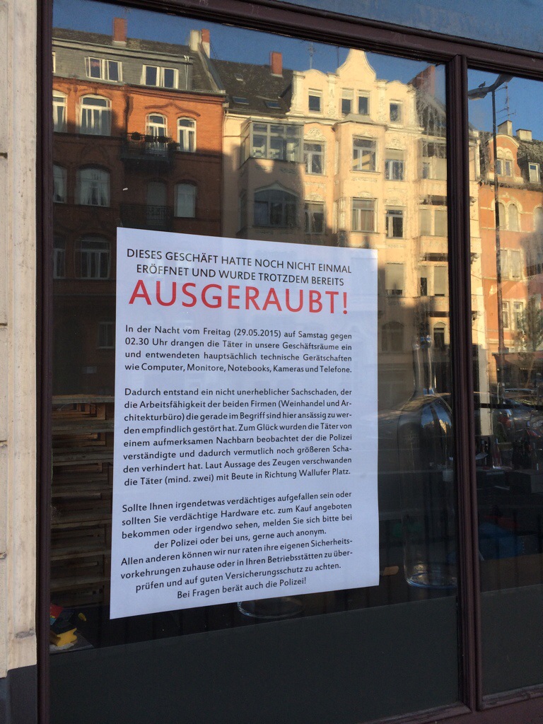 Wiesbaden, 4. Juni 2015 – Es passiert immer wieder: Einbrüche in der City. In der Nacht von letzten Freitag auf Samstag wurde ein Geschäft in der Schiersteiner Straße ausgeräumt bevor es überhaupt eröffnet hat! Die Chefs machen ihrem Unmut mit großen Plakaten im Schaufenster der ehemaligen Kaiser-Friedrich-Apotheke Luft: „Ausgeraubt“ steht da in großen roten Lettern. Und weiter: „Gegen 2.30 Uhr drangen die Täter in unsere Geschäftsräume ein“. Computer, Monitore, Notebooks, Kameras und Telefone schleppten die Unbekannten weg. Fieser Schaden für die beiden Firmen (Weinhandel und Architekturbüro) die grade starten wollen. Jetzt bitten sie um Hinweise zu den Tätern – die Kriminalpolizei nimmt sie unter Tel.: 0611/345-0 entgegen.