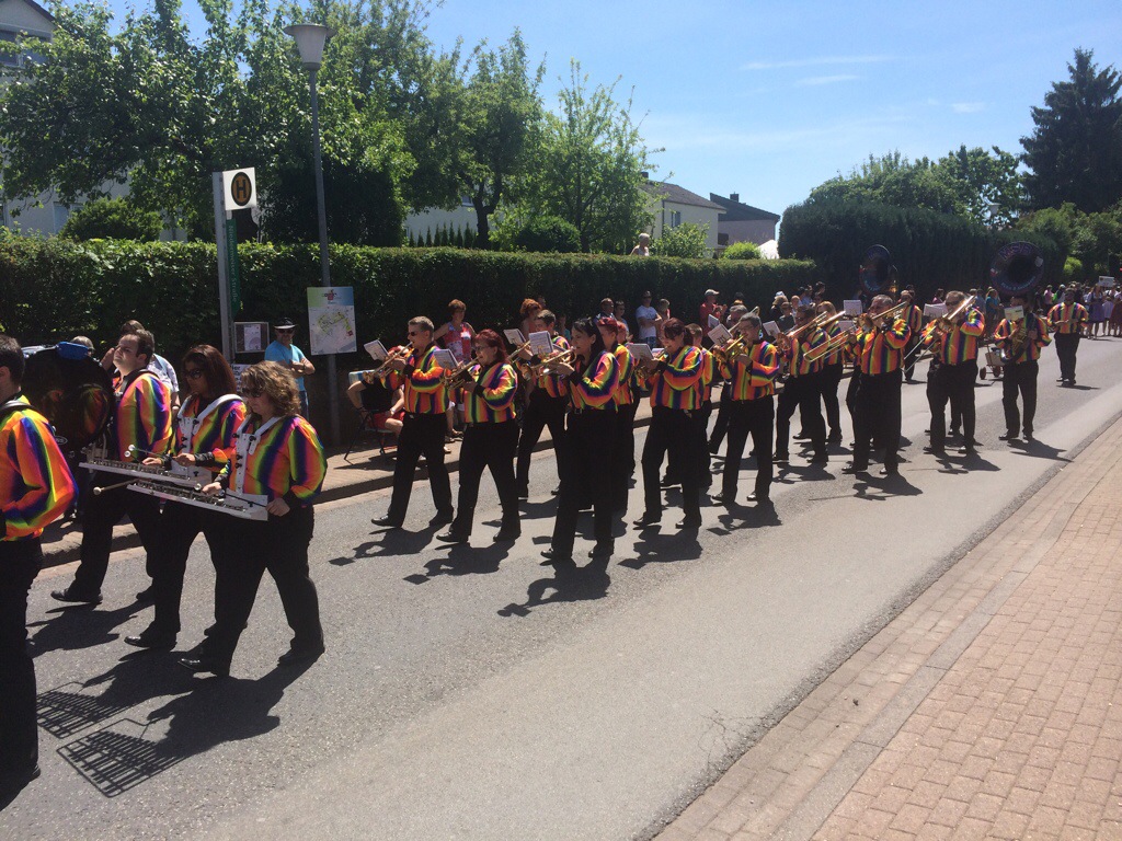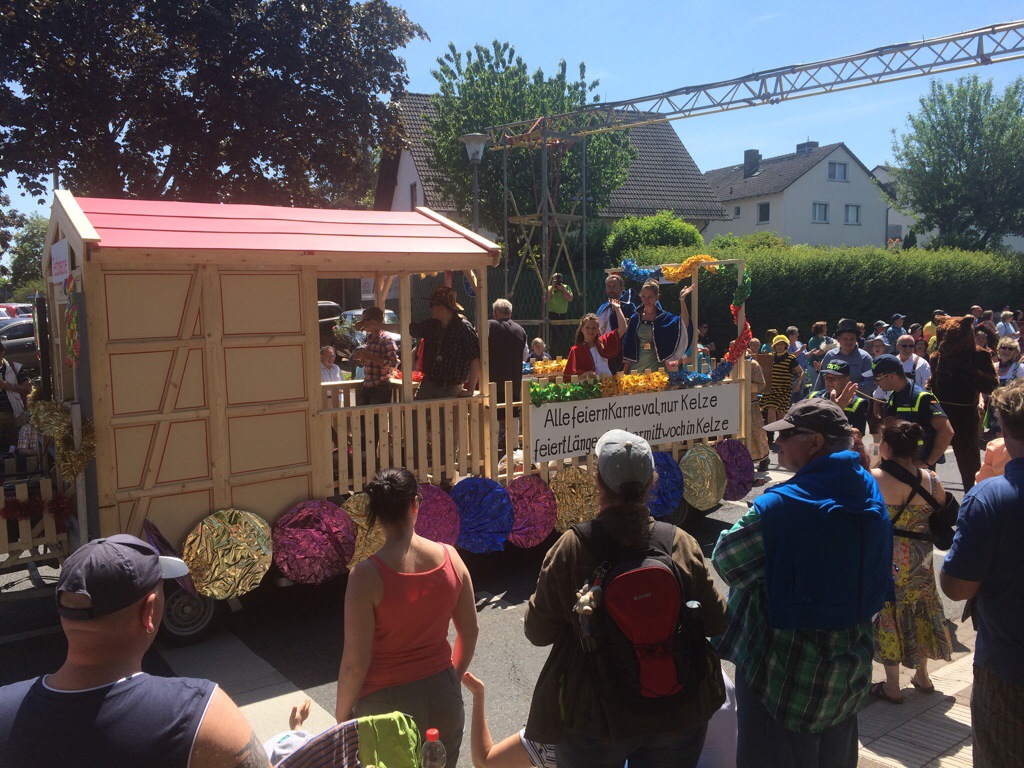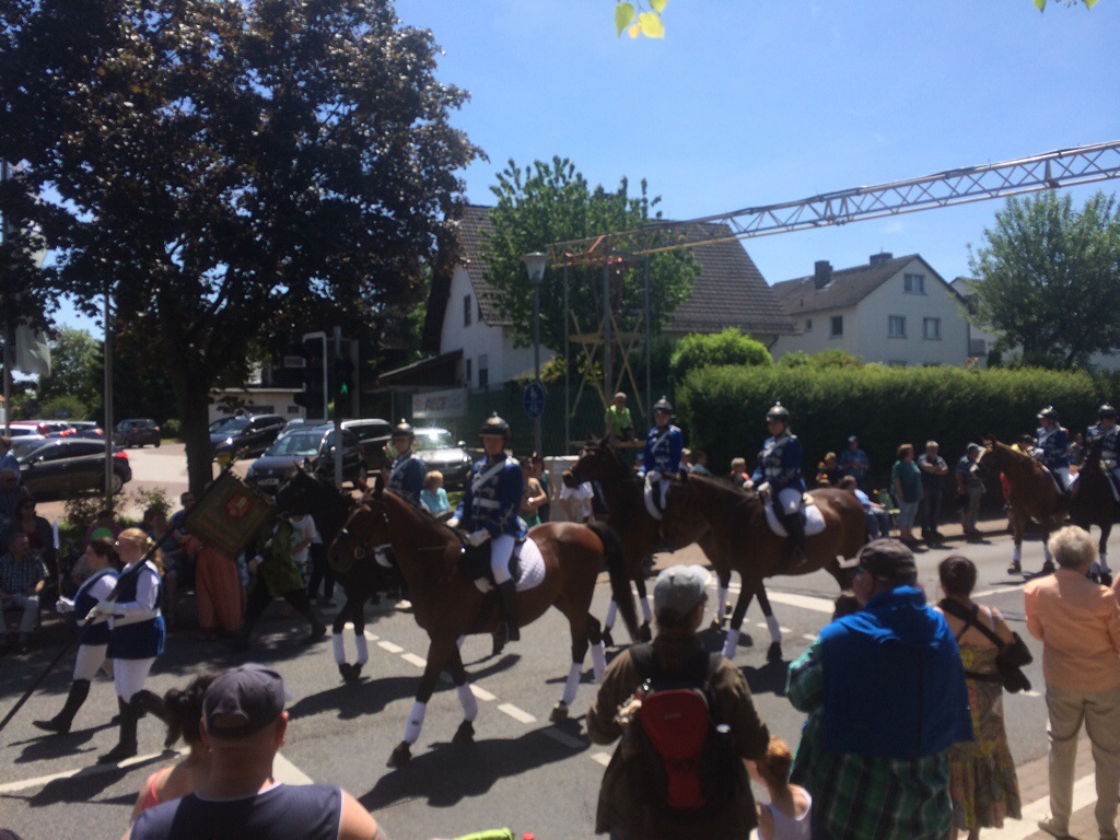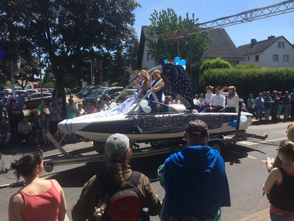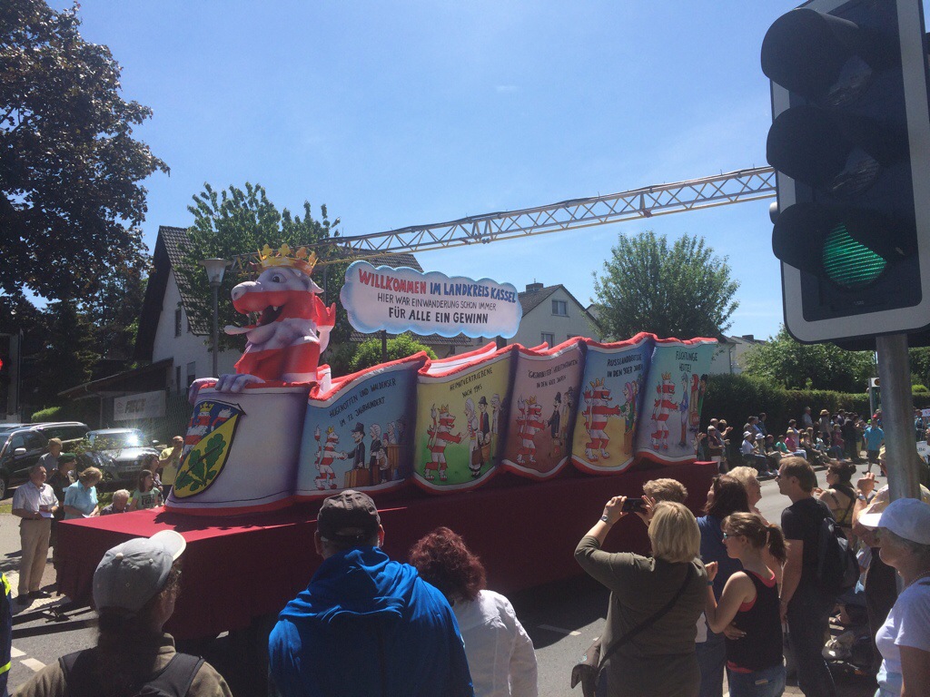 Hofgeismar/Wiesbaden, 7. Juni 2015 – Huldvoll, lächelnd, das Diadem auf dem Haupt: So krönte die Wiesbadener Weinkönigin Stephanie Kopietz heute den Hessentags-Abschluss-Festumzug in Hofgeismar. Strahlend winkte sie ins Publikum, begleitet von weiteren hübsch gewandeten Wiesbadenerinnen der Volleyball-Damen des TG Naurod bildete sie „Nummer 37“ im Hessentags-Umzug. Die Wiesbadener Jocus-Garde (Nr. 36) lief vorneweg, spielte was die Instrumente hergaben. Als Nummer 38 von 133 folgte der angekündigte Motivwagen der Stadt zum Thema „40 Jahre Weinwoche“. Noch beeindruckender waren allerdings der Motivwagen des Landkreises Kassel und die „Nixen“ aus Zissel. Im nächsten Jahr gibt’s eine neue Chance zu beeindrucken: Der Hessentag findet dann vom 20. bis 29. Mai 2016 in Herborn statt.
