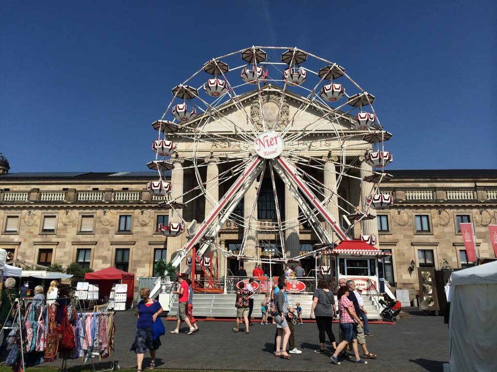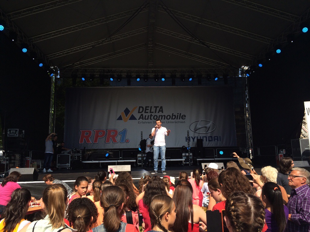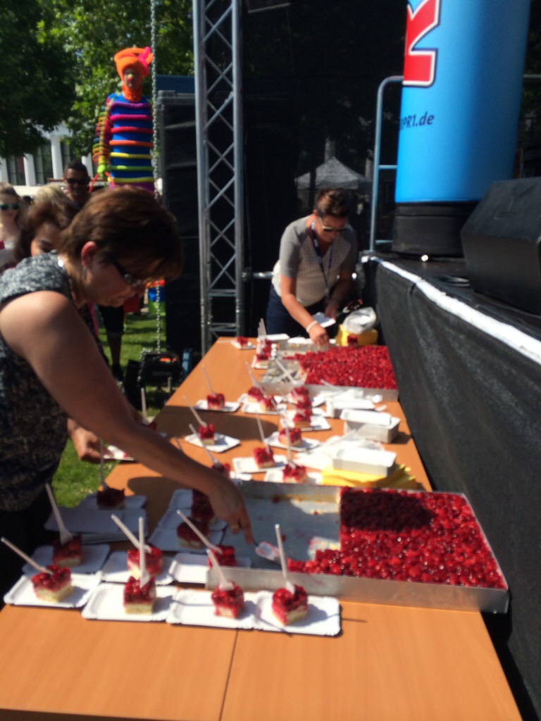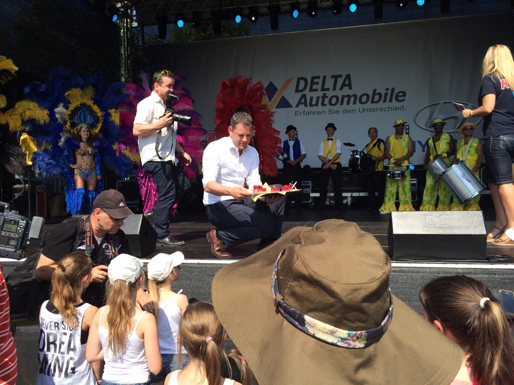 Wiesbaden, 12. Juni 2015 – Das 38. Wilhelmstraßenfest, offiziell Theatrium genannt, ist eröffnet. Oberbürgermeister Sven Gerich (SPD) betrat die Bühne am Kurhaus um 16 Uhr gut gelaunt in weißem Hemd und dunkler Hose („ich dachte mir, ein ohnmächtiger OB in Sakko und Krawatte bei der Hitze ist für Sie auch nicht so spannend“). Gerich lobte die ehrenamtlichen Helfer, begrüßte den Wirtschaftsdezernenten Detlev Bendel (CDU), gab Tipps: „Ich empfehle auch den Besuch in der Burgstraße, da haben wir in diesem Jahr neu Wiesbadener Gastronomen. Und beachten Sie auch die tollen Straßenkünstler“. Dann kamen zu ihm und RPR-Moderatorin Kate Menzyk alle Künstler des Eröffnungs-Acts auf die Bühne und Gerich erklärte: „Das 38. Wilhelmstraßenfest ist eröffnet“. Im Anschluss gab’s noch Erdbeerkuchen für die Zuschauer, dann ging’s im Programm weiter und Antonio Gerardi sang „It’s A Man’s World“.