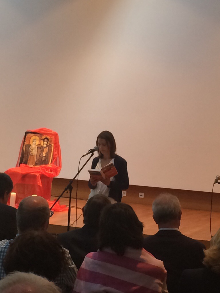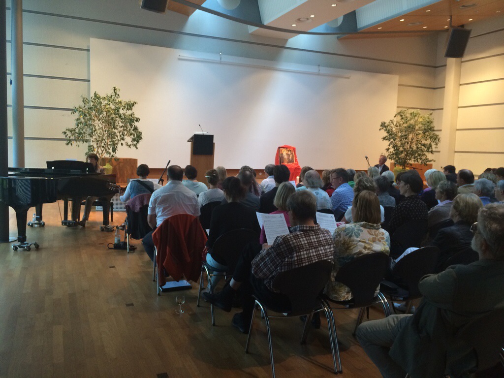 Zu Beginn sangen alle im Saal zusammen mit dem Taizé-Chor Lumen Cordium aus Walluf den Choral „Meine Hoffnung und meine Freude“. Dann sprach Hamburger, berichtete von seiner ersten Begegnung mit Roger: „Froh will ich Frère Rogers gedenken, der mir ans Herz gewachsen ist. Mein Buch ist ein Streifzug durch seine Welt. Er war scheu, hatte kein Machtstreben, keine Geltungssucht und viel Taktgefühl“.