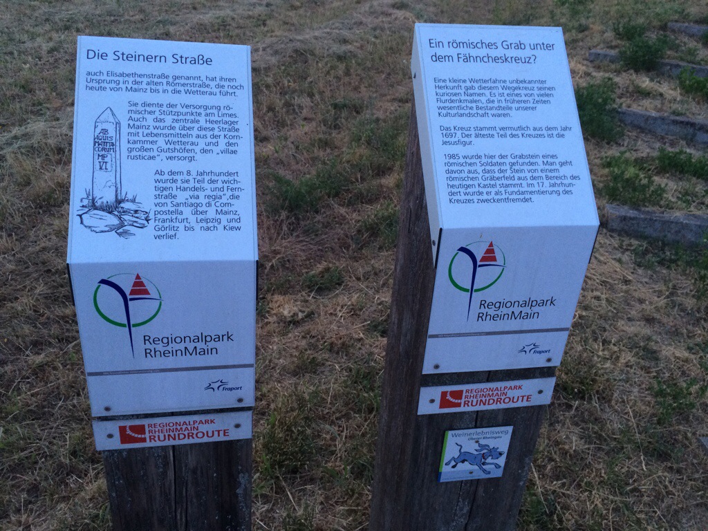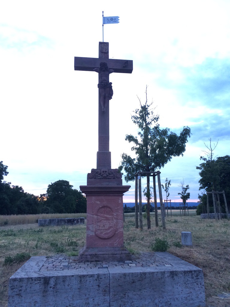 Mainz-Kostheim, 17. Juni 2015 – Das Fähncheskreuz in Kostheim (Steinern Straße) wurde 1697 errichtet. Es ist ein steinernes Wegkreuz mit einer daran befestigten metallenen Wetterfahne. Jetzt wurde es von Unbekannten schwer beschädigt: