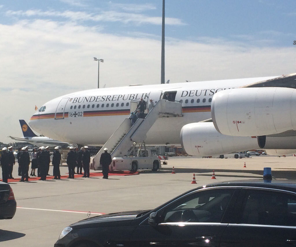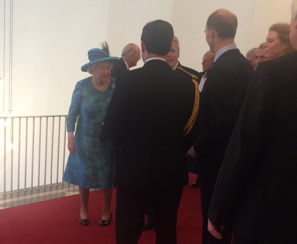 Wiesbaden, 25. Juni 2015 – Protokollarisch perfekt schwebte heute gegen 11.40 Uhr die Queen in Begleitung von Bundespräsident Joachim Gauck im Flugzeug der Bundesregierung aus Berlin auf dem Frankfurter Flughafen ein. Ihre Majestät, Elisabeth II., Königin von England, setzt damit heute ihren viertägigen Deutschlandbesuch fort. Nach der Landung sauste die Auto-Kolonne mit Bundespräsident Joachim Gauck und Hessen-MP Volker Bouffier, Sicherheitsleuten und Ärzten der Johanniter Wiesbaden in irrem Tempo los, um für die offizielle Begrüßung der Queen pünktlich an der Paulskirche in Frankfurt zu sein. Es klappte. Mit Glockenläuten, Kinderchor (Lied: „Die Gedanken sind frei“) und jubelnder Menge wurden die Königin (89) und ihr Gemahl, Prinz Philip (94), auf dem roten Teppich empfangen und nach einer kurzen Besichtigung der Paulskirche von Bundespräsident Gauck in das Frankfurter Rathaus, den „Römer“, geleitet. Dort wurde Wiesbaden besondere Ehre zuteil: Die Queen saß beim Mittagessen an Tisch „Wiesbaden“ zusammen mit Bundespräsident Joachim Gauck, Hessens Ministerpräsident Volker Bouffier, Queen-Großneffe Donatus Landgraf von Hessen mit Gattin Floria, Sir Simon McDonald dem Britischen Botschafter in Berlin, Landtagspräsident Norbert Kartmann, der Generalkonsulin von Serbien Aleksandra Djordjevic und Daniel Nicolai, Intendant des English Theatre Frankfurt. Die Königin und Bouffier hielten Tischreden. 116 Gäste lauschten gespannt.