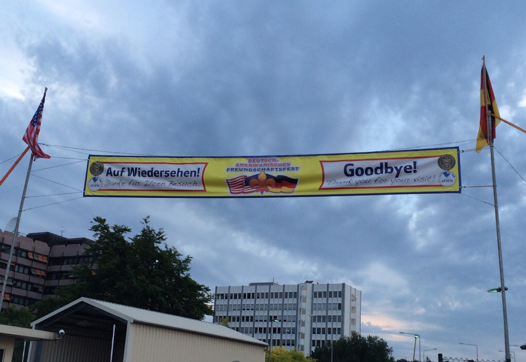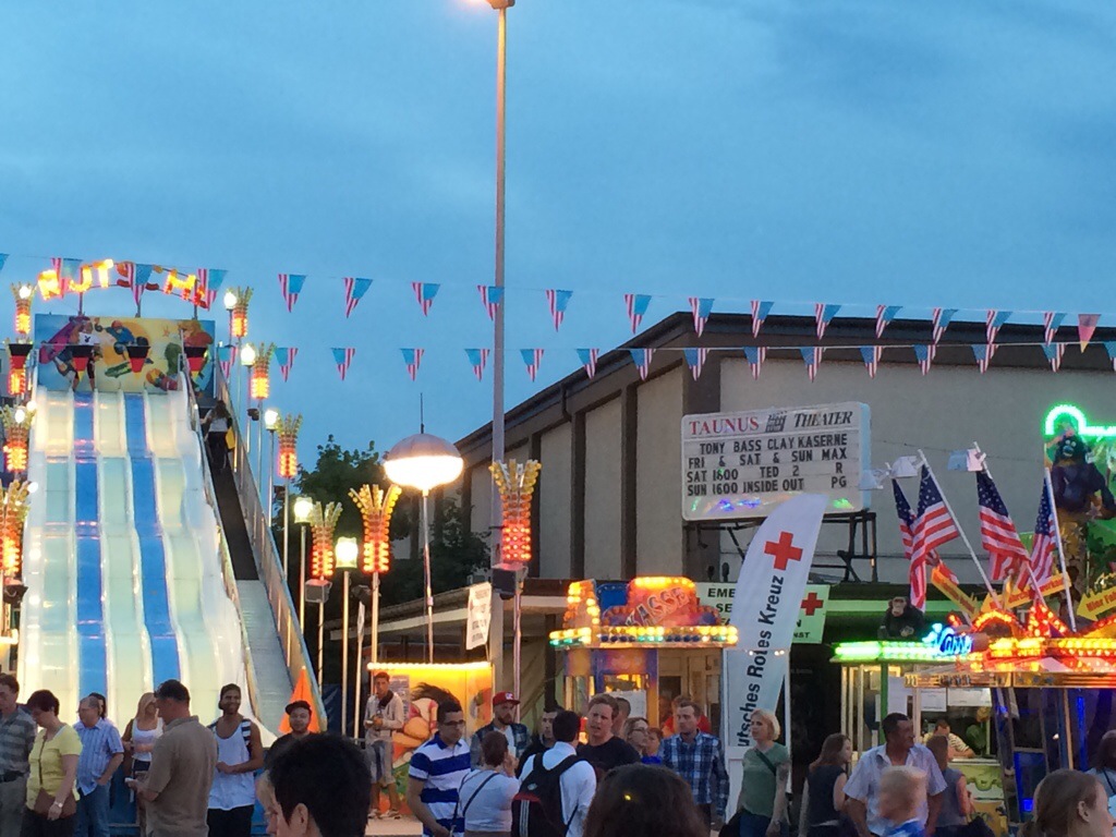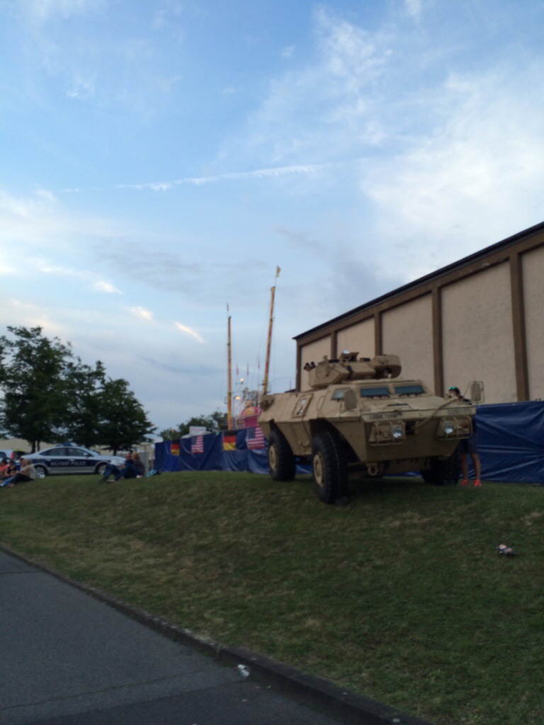 Fritten 5 Euro, Hot Dog oder Tacos 3,50 Euro, American Icecream 500 ml 3,70 Euro, 7 Donuts 3 Euro und der gute deutsche Nierenspiess 4 Euro. Hinterher Cola oder Limo für 2 Euro, Bier oder Radler für 3,50 Euro. Dazu spielt eine Band live „Bad Bad Leeroy Brown“ im Open-Air Festzelt, die Militärpolizei läuft friedlich Streife, dazwischen deutsche Sanitäter und entspannte Festbesucher. Gelungener Auftakt. Impressionen vom ersten Fest-Abend gibt es hier: