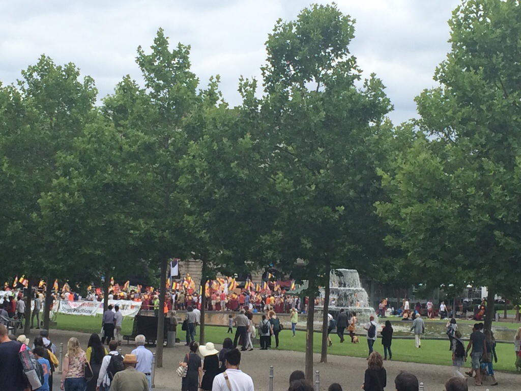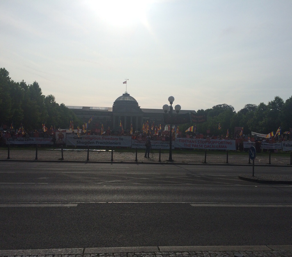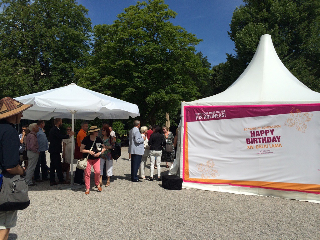 Wiesbaden, 12. Juli 2015 – Heute Morgen gegen 5.30 Uhr kam der Dalai Lama, geistiges Oberhaupt der Tibeter, im VIP-Bereich des Frankfurter Flughafens an. Drei Tage wird er anlässlich seines 80. Geburtstages (der eigentlich schon am 6. Juli war) in Hessen bleiben (MEIN WIESBADEN berichtete). In Polizeibegleitung mit Blaulicht fuhr die Kolonne nach Wiesbaden zum Hotel Nassauer Hof. Dort erwartete den Dalai Lama eine kleine Gruppe Anhänger mit Willkommens-Plakaten. Später versammelten sich Demonstranten auf dem Bowling Green vor dem Kurhaus, riefen lautstark mit Trommelklängen hinüber zum Hotelzimmer des Ehrengastes: „Dalai Lama, hör auf zu lügen!“ und „Dalai Lama, gib Religionsfreiheit“. Die Internationale Shugden Community (ISC) hatte den Protest angekündigt. Die Proteste richten sich laut ISC gegen die angebliche Verfolgung von Shugden-Buddhisten durch den Dalai Lama. Pech für die Demonstranten: Man versteht sie kaum, das rhythmische Trommeln gefällt aber den Passanten.