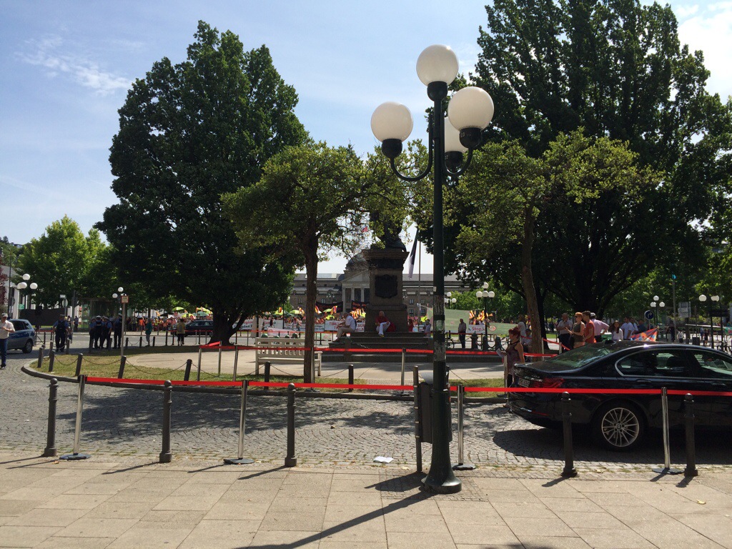 Sprach’s, sagte „Good Bye“ und geht jetzt „duschen und schlafen“ im Nassauer Hof. Übrigens: Die Demonstranten trommeln und rufen immer noch vor seinem Hotel…