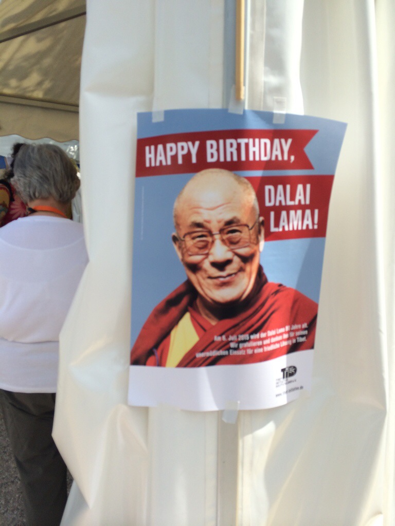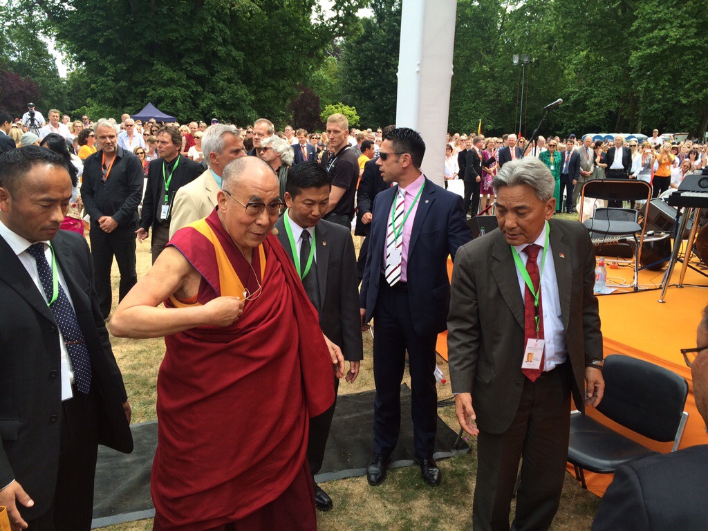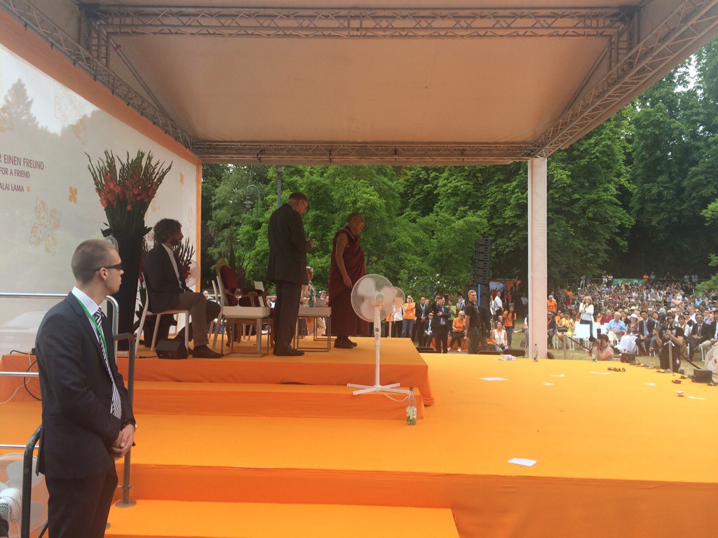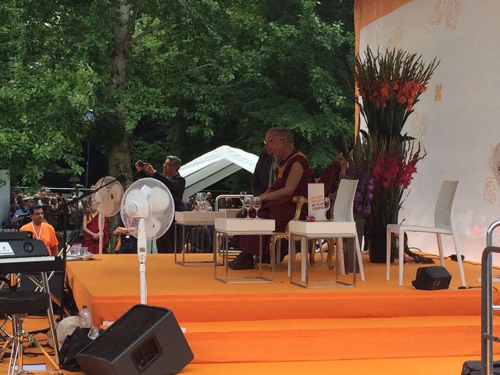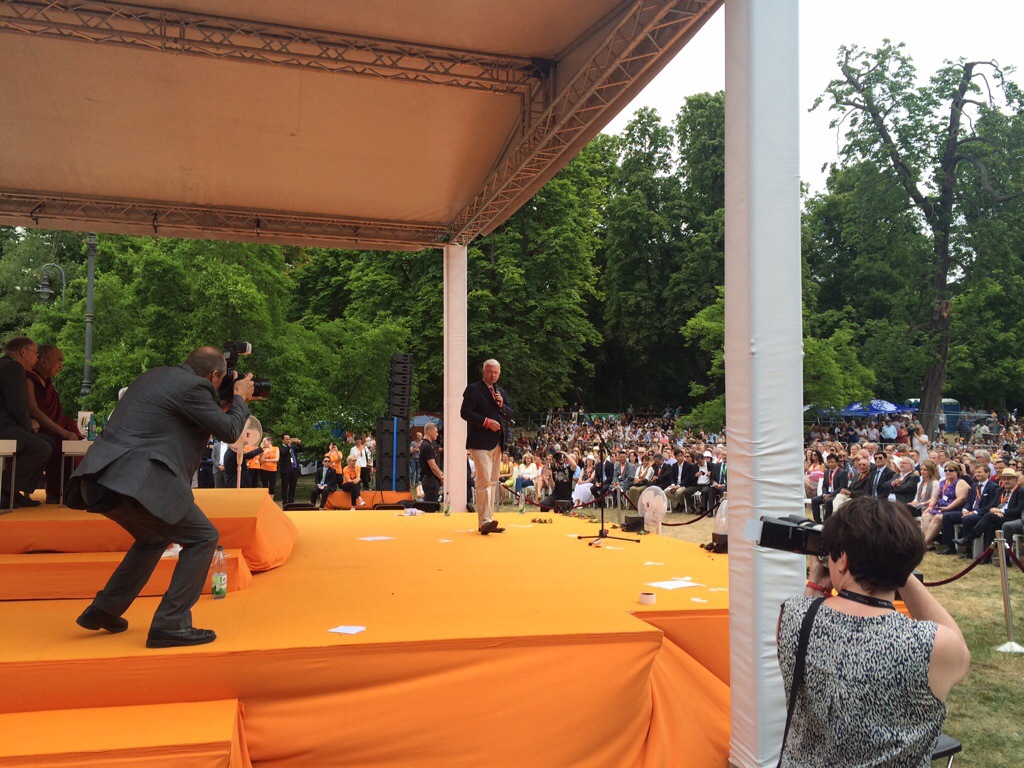 Dieser Ort der so schön grün ist, zeigt uns, wie wichtig eine intakte Umwelt ist. Die Vögel die von Baumwipfel zu Baumwipfel fliegen, machen diesen Tag noch schöner.“ Da lacht der Dalai Lama. Weiter sagt er: „Ich danke den Rednern, die ihre ernste Sorge um Tibet zum Ausdruck gebracht haben. Unsere Freundschaft wird bis in nächste Leben reichen. Die Kraft der Wahrheit ist mächtiger als die Kraft der Gewalt. Alle 7 Milliarden Menschen auf der Welt sind gleich, alle wollen glücklich leben, alle haben das Recht auf ein glückliches Leben.