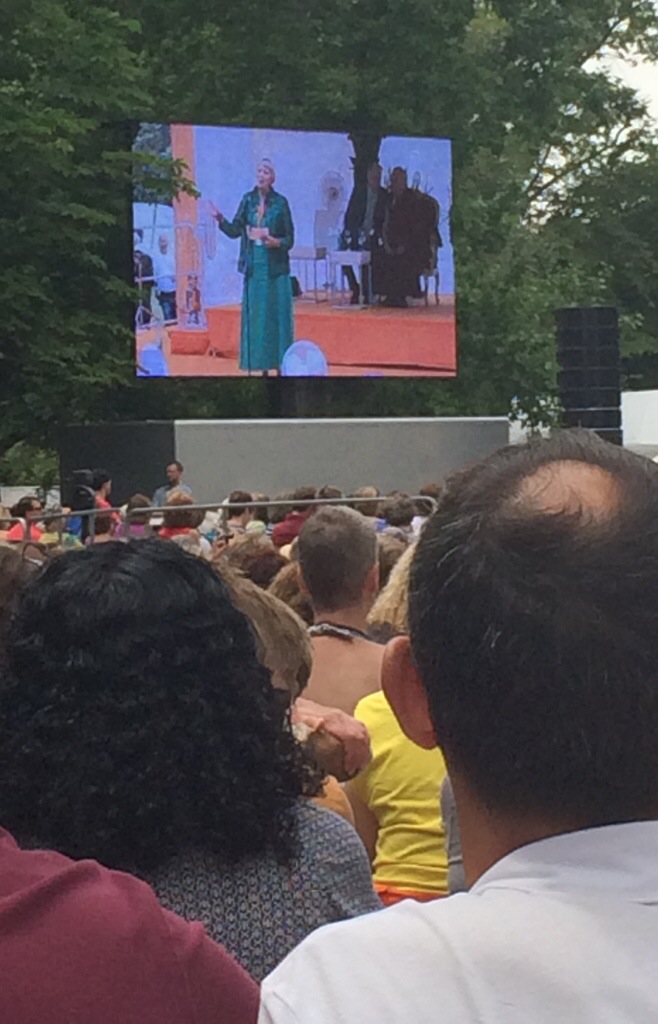 Um 14.28 Uhr spricht der Dalai Lama dann endlich live (auf Englisch) zu den Besuchern im Kurpark: