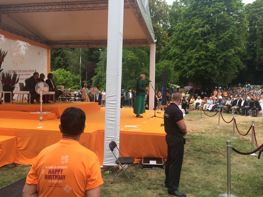 Bürgermeister Arno Goßmann (SPD) in seiner Begrüßungs-Rede: „Wiesbaden freut sich auf Eure Heiligkeit. Sie waren zu Ihrem 70. Geburtstag hier und sind es jetzt zu Ihrem 80. wieder. Es ist eine Ehre für Wiesbaden.“ Claudia Roth (Grüne), Vizepräsidentin des Deutschen Bundestages, begrüßt den Dalai Lama in krachgrünem Kleid: „Danke für 56 Jahre gewaltlosen Widerstand.“ Sie fordert Peking auf, den Dialog aufzunehmen. Tibet solle frei leben können.