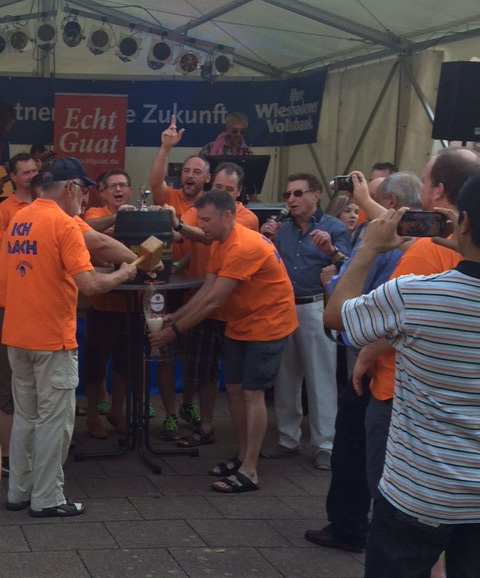 Wiesbaden, 8. August 2015 – Der Pfarrer-Luja-Platz war voll, „ein Prosit der Gemütlichkeit“ tönte aus allen Kehlen, die Äppelblüte-Königin Franziska I. war auch dabei: Gestern Abend, Eröffnung der Dotzheimer Kerb 2015.