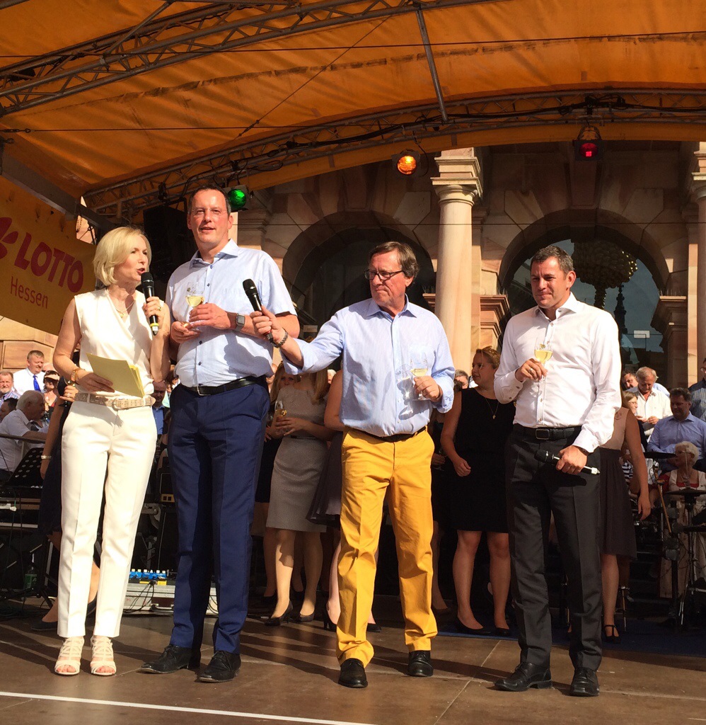 Schließlich bog noch – Überraschung – der Mainzer OB Michael Ebling (SPD) um die Ecke: „Der Lieblingskollege aus Wiesbaden hat gesagt, komm mal vorbei. Außerdem feiern Sie ja 40 Jahre.“ Er gab zu: „Ich bin neidisch. Das ist ein toller Platz und Ihr Rathaus ist saniert – das ist bei uns noch nicht der Fall.“ Jetzt darf er bis 23. August kräftig mitfeiern. Oberbürgermeister Sven Gerich (SPD) eröffnete feierlich das Fest, wünschte allen Gästen „viel Spaß“. Zum Jubiläum gibt’s 115 Stände, 50 Musikgruppen und Bands auf drei Bühnen rund ums Rathaus, tolle Deko (6 Meter hohes Weinglaus aus Ballons), Winzer-Jubiläums-Aktion und mehr. Weitere Details zum Fest gibt es hier (klick). Das komplette Programm gibt es hier (klick).