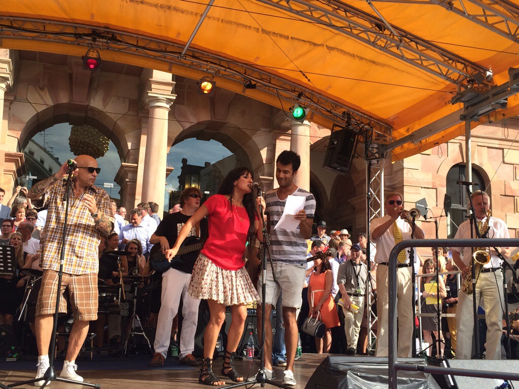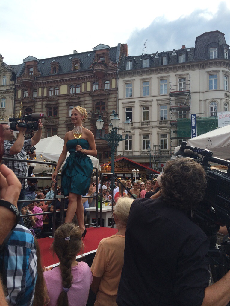 Detlev Bendel (CDU) wünschte „10 tolle Tage, wir haben allen Grund zu feiern“. Oberbürgermeister Sven Gerich (SPD) begrüßte um 17 Uhr die zahlreichen Gäste auf dem sonnigen Schloßplatz. Dann schritten zur Jubiläums-Weinfest-Eröffnung 24 Wein-Majestäten über einen Laufsteg auf die Bühne vor der Rathaus-Treppe. Für die Hoheiten aus Wiesbaden und dem Rheingau (Wicker, Kostheim, Walluf, Martinstal, Erbach, Kiedrich, Winkel, Johannesberg, Geisenheim, Lorch und die Äppelblütekönigin aus Naurod) gab’s jeweils von OB Gerich ein Begrüßungs-Küsschen. Dann spielten – eine Premiere – die “Rheingauer Weinwoche Stars” (Musiker aus beliebten Weinwoche-Traditions-Gruppen wie der „Juristenband“) den Kool & The Gang-Song „Celebration“. Ohne Probe und Soundcheck, dafür sehr gut.