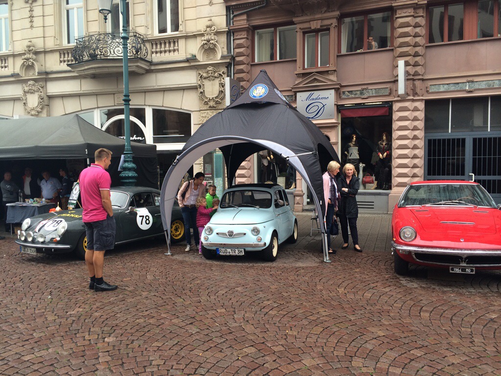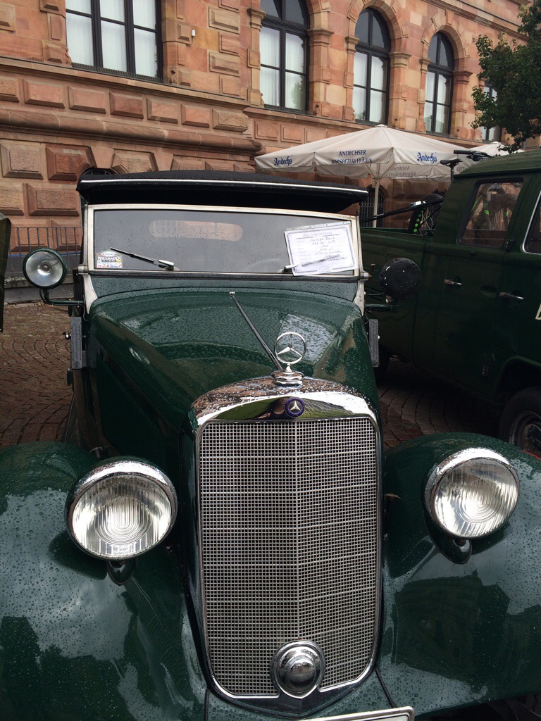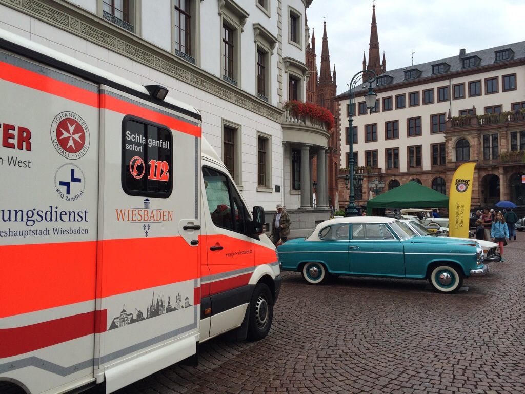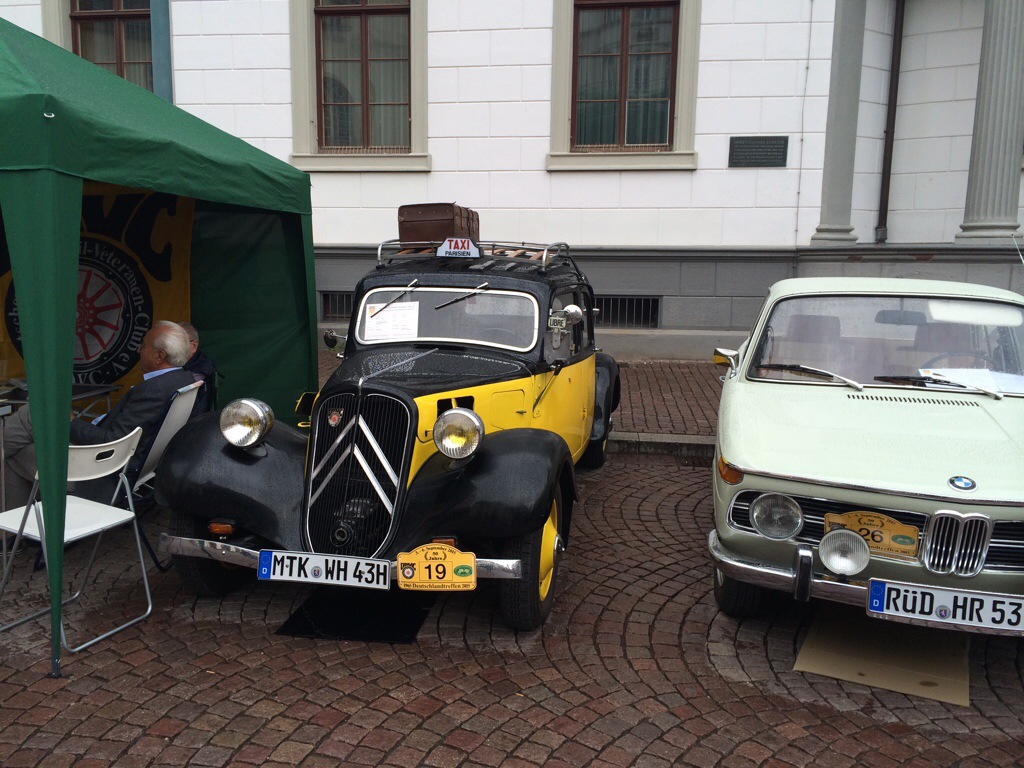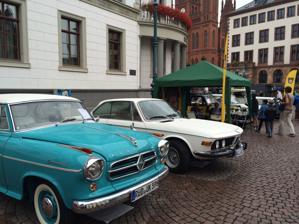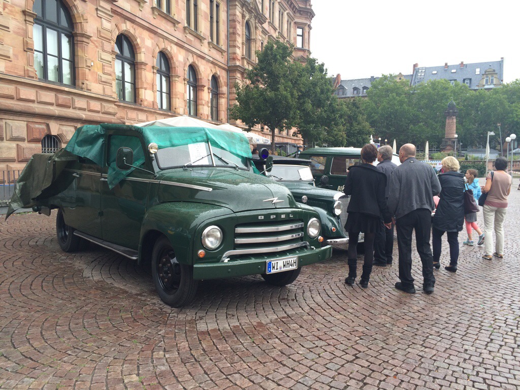 Wiesbaden, 13. September 2015 – „Der Tag des offenen Denkmals“ ist in vollem Gange, tausende Besucher werden in den Kulturdenkmälern erwartet (MEIN WIESBADEN berichtete). Dass auch Oldtimer dazu gehören, beweist heute am Schlossplatz rund um das Rathaus die „Initiative Kulturgut Mobilität“. Alles was Reifen hat, ist dabei, vom Baby-Fiat bis zum dicken Opel Blitz. Rundherum Neugierige oder Besucher, die gleich weitereilen: Zum Besuch im Landtag beim „Tag des offenen Denkmals“.