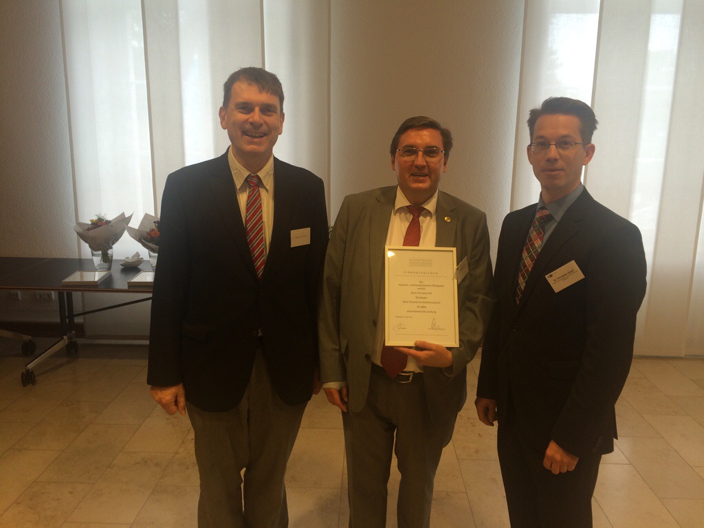 Unter den Geehrten: Christian Hill (Foto Mitte), Vorstandsmitglied der Wiesbadener Mittelstandsvereinigung, hier nach der Ehrung mit IHK-Präsident Dr. Christian Gastl (r.) und dem Vorsitzenden der Mittelstandsvereinigung, Dr. Reinhard Völker.