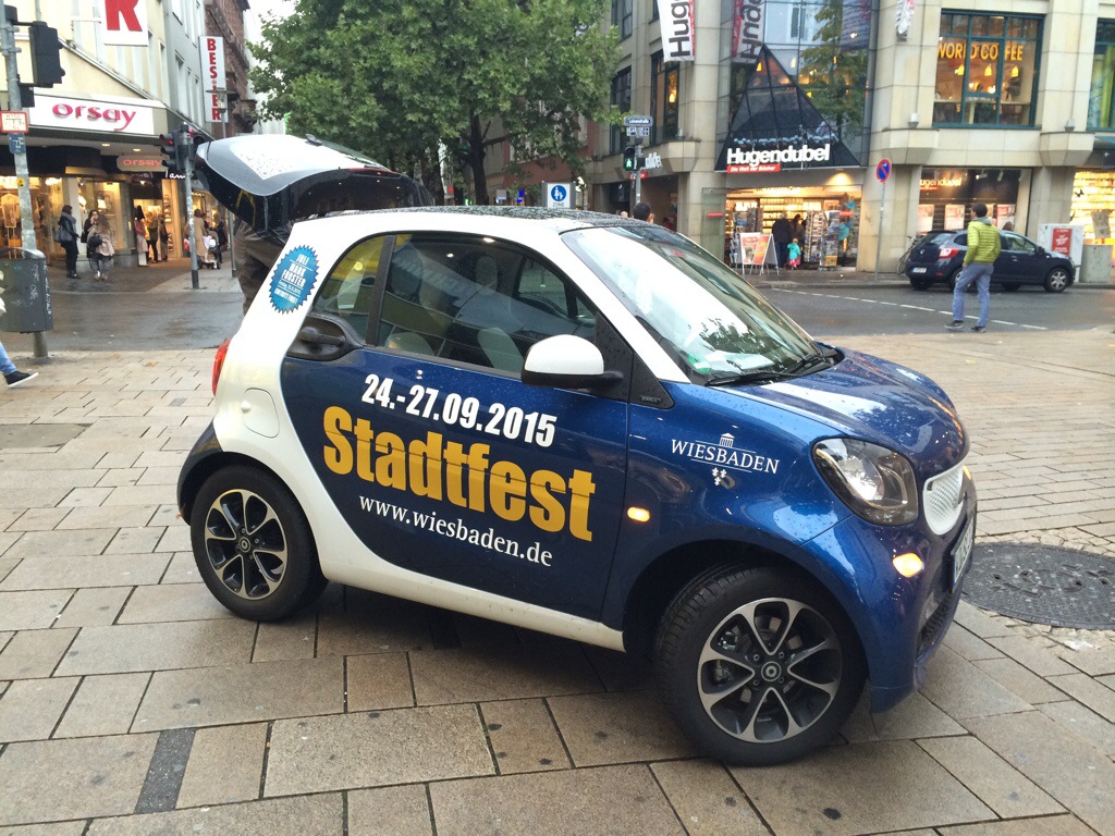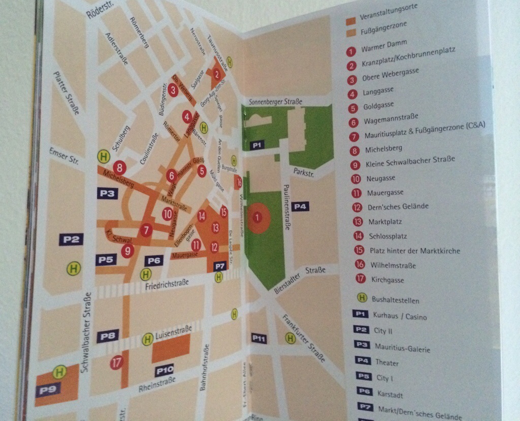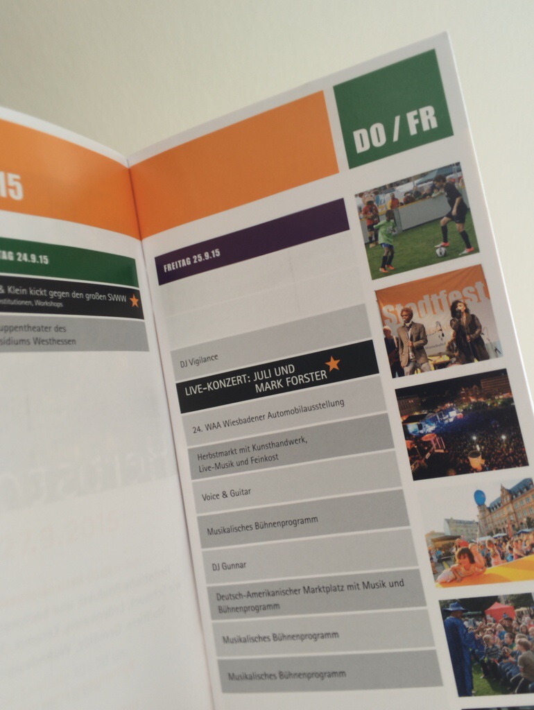 Wiesbaden, 17. September 2015 – Vom 24. bis 27. September lockt das Stadtfest, heute werden dazu 60 Seiten dicke Info-Broschüren in der City verteilt. Wer keine abbekommt, kann sich online hier (klick) informieren. Geplant sind Herbstmarkt (Fußgängerzone, 25. bis 27.9., ab 10 Uhr), Kinderfest (24.9., Kranzplatz), verkaufsoffener Sonntag (27.9., 13 bis 18 Uhr), Automobilausstellung (25. bis 27.9. auf dem Schlossplatz), Erntedankfest (26. und 27.9., am Warmen Damm) und viel, viel mehr. Highlight ist am Freitag das Live-Konzert von „Juli“ und Mark Forster (Eintritt frei), Samstag und Sonntag gibt’s eine Fashion-Show mit den Bundesliga-Volleyball-Damen des VC Wiesbaden auf der Rue.