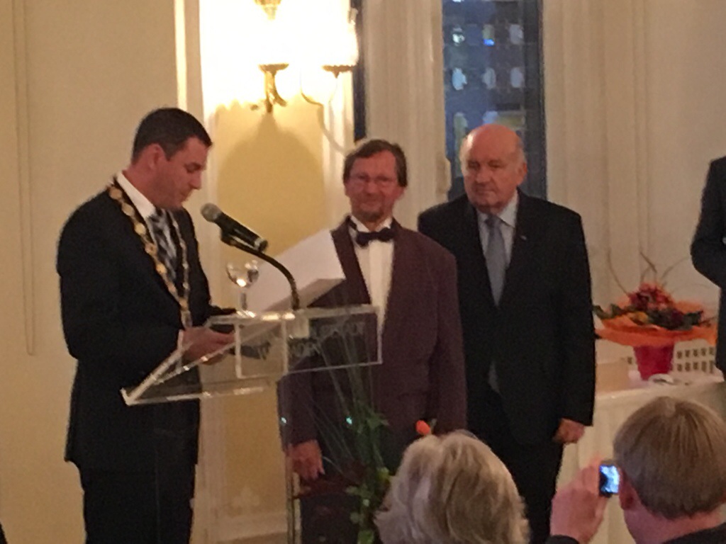 Oberbürgermeister Sven Gerich (SPD, Foto oben l.) und Stadtverordnetenvorsteher Wolfgang Nickel (CDU, Foto r.) gratulierten dem Preisträger. Das Streicher-Quartett der Wiesbadener Musik- und Kunstschule spielte, die Laudatio hielt Christian Dietrich, Thüringer Landesbeauftragter zur Aufarbeitung der SED-Diktatur.
