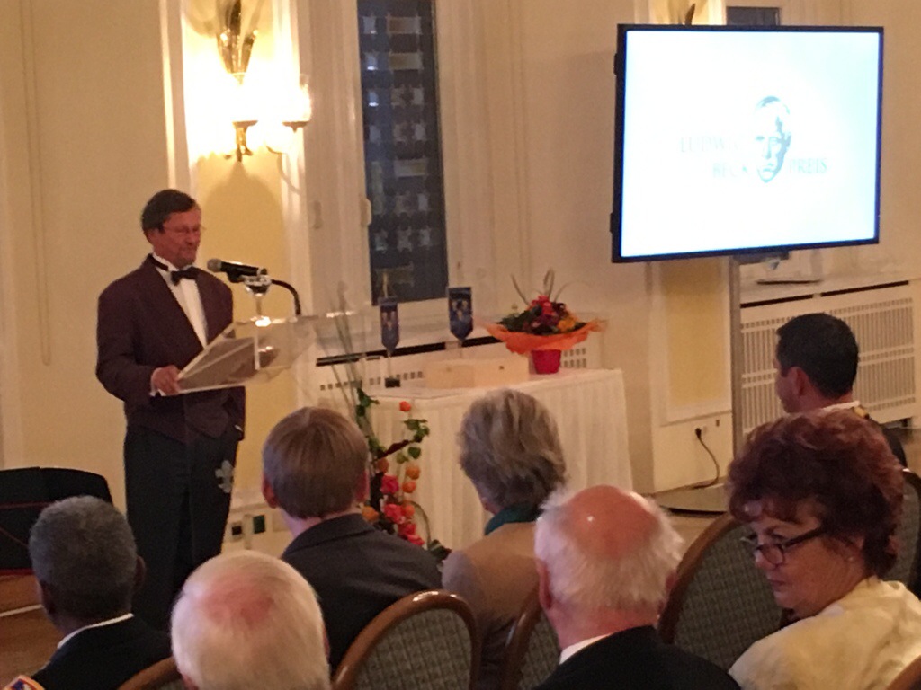 Doch heute Abend sprach Wonneberger: Er nahm den Preis persönlich im Rathaus entgegen (Foto oben Mitte). Aber: Er wies in seiner Rede auch auf seine ablehnende Haltung zum Militär hin – vor einigen Uniformträgern von deutscher und amerikanischer Seite im Publikum. Der Ludwig-Beck-Preis (mit 10.000 Euro dotiert) trägt den Namen des in Biebrich geborenen Widerstandskämpfers Generaloberst Ludwig Beck. Beck hätte nach dem Gelingen des Attentats auf Hitler am 20. Juli 1944 deutsches Staatsoberhaupt werden sollen.