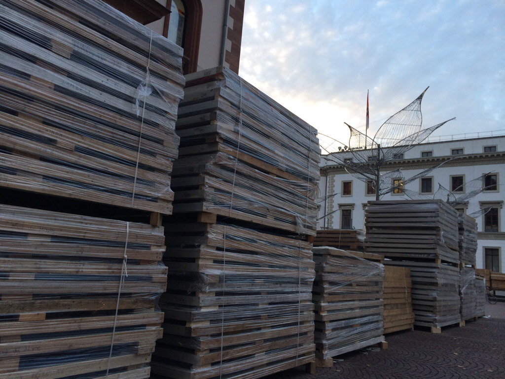 Wiesbaden, 7. November 2015 – Donnerstag standen sie fest verpackt zwischen Rathaus und Marktkirche: Meterhohe Pakete, dick in Folie eingewickelt. Was da wohl drin ist? Fans wissen es: Die Stände für den Sternschnuppenmarkt sind da, werden wie ein Mega-Puzzle seit Tagen von fleißigen Fachleuten auf- und zusammengebaut, Markierungen auf dem Boden legen die Standpositionen fest. Natürlich wurde zeitgleich auch die Lichterdeko in den Bäumen am Rathaus vorbereitet. Birne für Birne. Fleißarbeit. Hier gibt’s den Aufbau in Bildern: