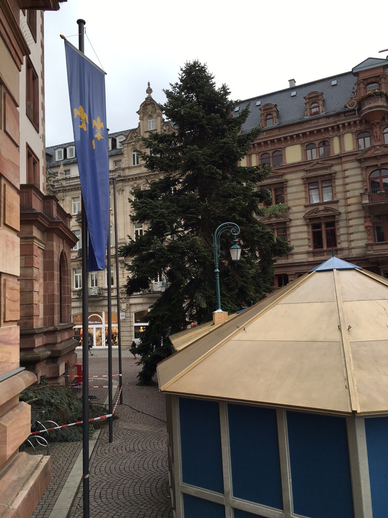 Schon vor einer Woche hatte Wiesbadens Wirtschaftsdezernent Detlev Bendel (CDU) die Wiesbadener zum Baum-Aufstellungs-Termin eingeladen: „Es ist immer wieder beeindruckend zu sehen, wie der mächtige Baum in Position gebracht und fest verankert wird“.