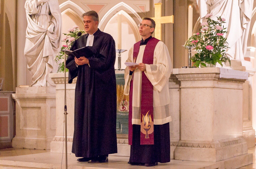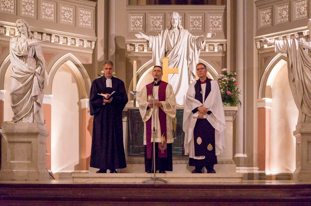 Rund 130 Besucherinnen und Besucher kamen mit Dekan Martin Mencke, Domkapitular Wolfgang Pax und Reverend Christopher Easthill (von links) zum Friedensgebet in die Marktkirche Fotos: Benjamin Dahlhoff/St. Bonifatius