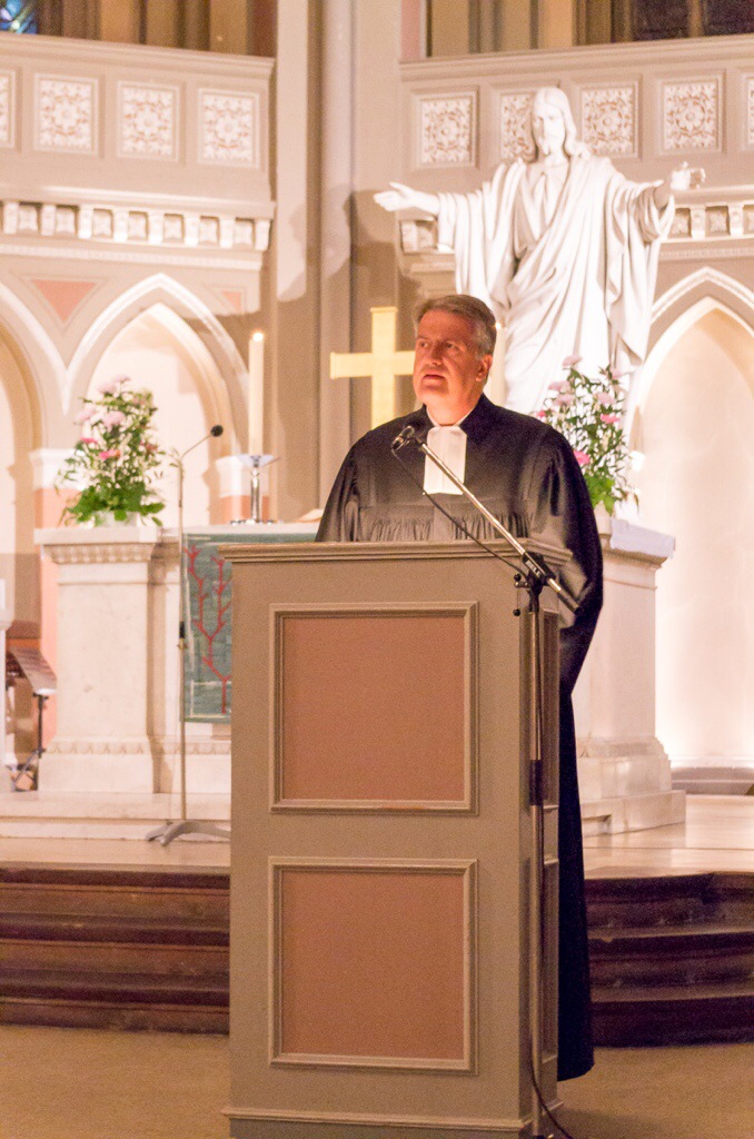Dekan Martin Mencke rief in seiner Kurzpredigt zur Besonnenheit auf: „Lassen wir uns von diesen Attentaten nicht die Logik der Attentäter aufzwingen. Auf ein Attentat folgt nicht Krieg. Lasst uns ihnen das nicht geben. Lasst uns die Freiheit bewahren, denn um sie geht es hier, auch die Freiheit des Handelns.“ Gott, so Menckes feste Überzeugung, wolle mit diesen Attentaten nichts zu tun haben: „Nichts mit diesem Hass, dieser Gewalt, dieser Barbarei.“