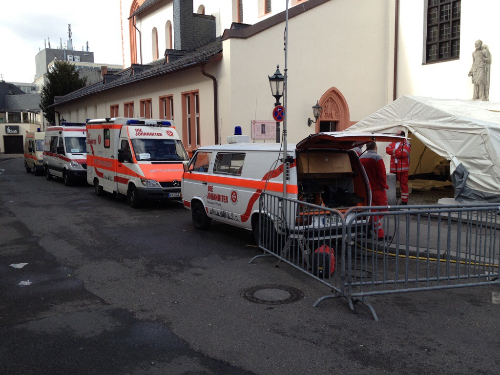 Wiesbaden, 7. Februar 2016 – Das gab’s noch nie: Der Mainzer Rosenmontagszug wurde heute von den Verantwortlichen des Mainzer Carneval Vereins (MCV) wegen der Sturmgefahr abgesagt. Aber die Wiesbadener Helfer der Johanniter-Unfall-Hilfe (JUH) sind morgen trotzdem in Mainz vor Ort, sollen Fassenachter bei der Straßenfastnacht betreuen, die trotz Sturm erwartet werden. Schon in den vergangenen Jahren haben die Wiesbadener Retter beim Rosenmontagszug mit Sanitäter-Fußstreifen und im Sanitätszelt am Leichhof Fassenachter versorgt (Foto oben). Ob morgen viel zu tun sein wird, wird sich zeigen: Der Deutsche Wetterdienst warnt für morgen in Mainz vor Sturmböen mit Geschwindigkeiten zwischen 65 km/h und 85 km/h, in Schauernähe sogar vor schweren Sturmböen bis 100 km/h.