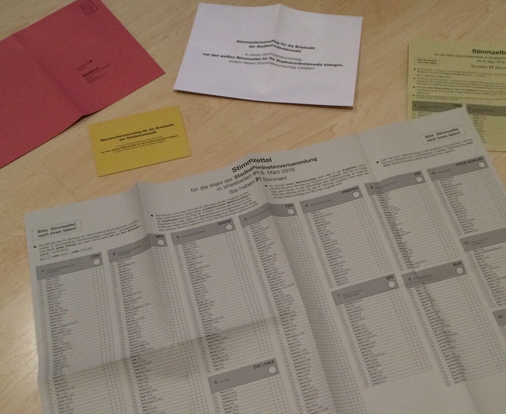 Wiesbaden, 23. Februar 2016 – Am 6. März dürfen wir wieder Stimmzettel ankreuzen und zu Wahlurnen pilgern: Dann ist Kommunalwahl in Hessen. Auch diesmal gibt’s in Wiesbaden wieder weiße Couchtisch-große Mega-Wahlzettel (für die Wahl der Stadtverordnetenversammlung) und kleinere farbige Stimmzettel (für die Ortsbeiratswahl in den Wiesbadener Stadtbezirken). Seit dem Jahr 2000 gilt das neue Kommunalwahlrecht in Hessen: Statt nur eine Partei(-Liste) anzukreuzen, hat man seitdem so viele Stimmen, wie Sitze zu vergeben sind. Heißt in Wiesbaden: 81 Stimmen für die Wahl der Stadtverordnetenversammlung und zwischen 5 und 17 Stimmen für die Wahl des jeweiligen Ortsbeirates. Wähler können dabei Bewerbern bis zu 3 Stimmen geben (Kumulieren) und man kann jetzt die Stimmen auch auf Kandidaten aus verschiedenen Wahlvorschlägen verteilen. Zu kompliziert? Wer das mal mit Beispielen und Fachwissen erklärt haben möchte, findet eine Anleitung vom Wahlamt der Stadt hier (klick).