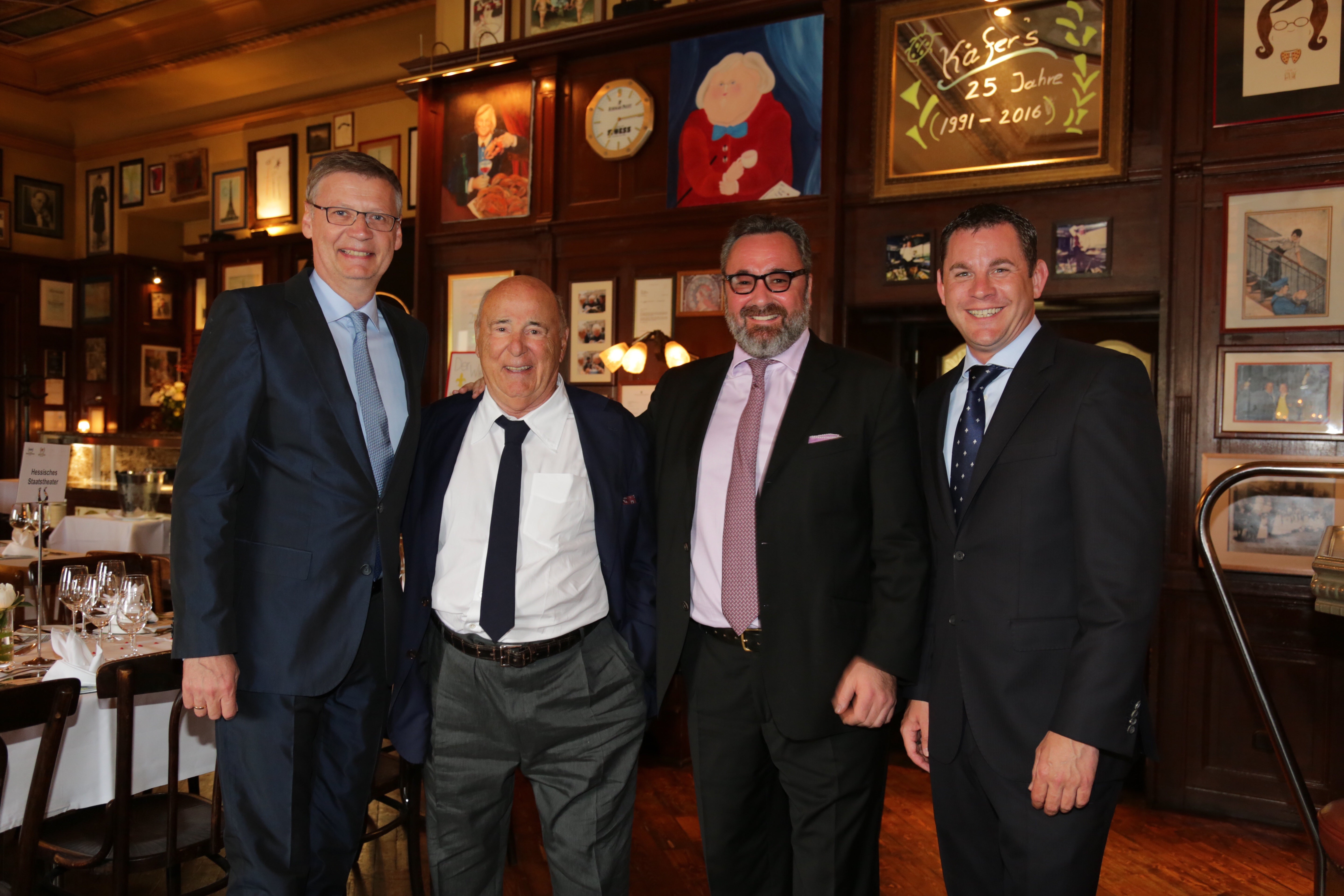 Wiesbaden, 13. Mai 2016 – Mit Kaviar, Kalbshaxe und Topfen-Soufflé feierten gestern Abend rund 200 Gäste den 25. Geburtstag des Käfer’s Bistro im Kurhaus. OB Sven Gerich (SPD) brachte Käfer’s Bistro-Chef und Mitbegründer Roland Kuffler ein gerahmtes Wiesbaden-Bild als Geschenk, TV-Größen wie Günther Jauch (59) und Dieter Kürten (81) waren ebenso dabei wie Käfer-Witwe Uschi Ackermann (69) und viele handverlesene Stammgäste. Für eine Schweigeminute hielten alle inne für den vor einem Jahr verstorbenen Gerd Käfer († 82) und seine verstorbenen Wegbegleiter. Dann ging es weiter wie Gerd Käfer es sich wohl gewünscht hätte: Freundlich-fröhlich mit entspannten Gesprächen. Es durfte in Erinnerungen geschwelgt werden: Unvergessen der Andrang beim etwas unterschätzten Public Viewing zur heimischen Fußball-WM 2006, als ganz Wiesbaden den Kurpark stürmte und vom Helfer bis zum damaligen Kurhaus-Gastronomie-Direktor Gebhard Bucher († 58) jede freie Hand an den Zapfhahn hechten musste. Oder das Catering einer russischen Hochzeit im Thiersch-Saal, wo 300 Gäste zwei Tage lang mit Champagner, Wodka und Kaviar umsorgt wurden – die Hochzeitstorte wog 600 Kilo und mehr als 20.000 Rosenblüten gaben die Deko ab.