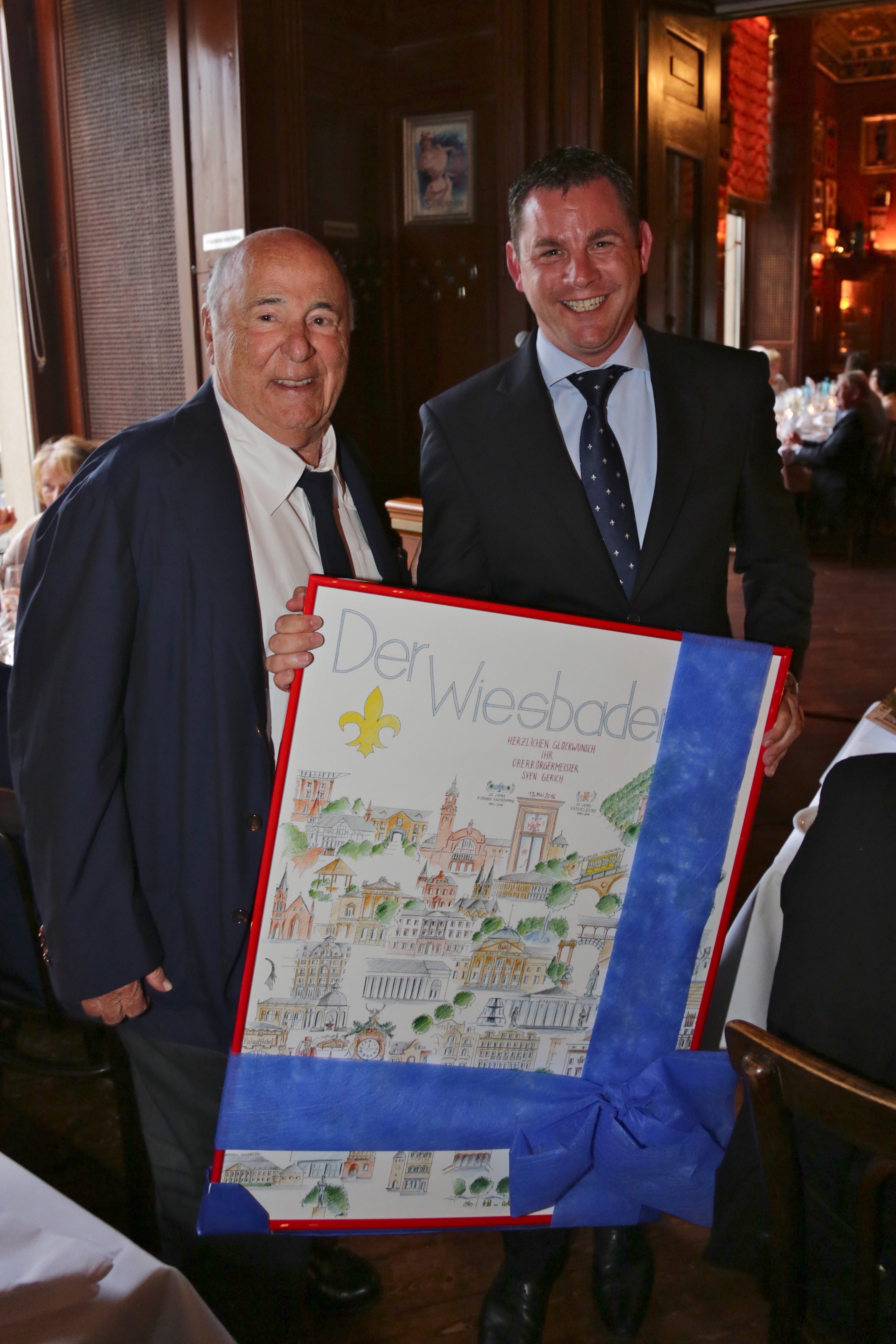 Geschenk für den Käfer’s Bistro-Mitgründer: Ein Wiesbaden-Bild von OB Sven Gerich für Roland Kuffler Foto: Kurhaus Gastronomie