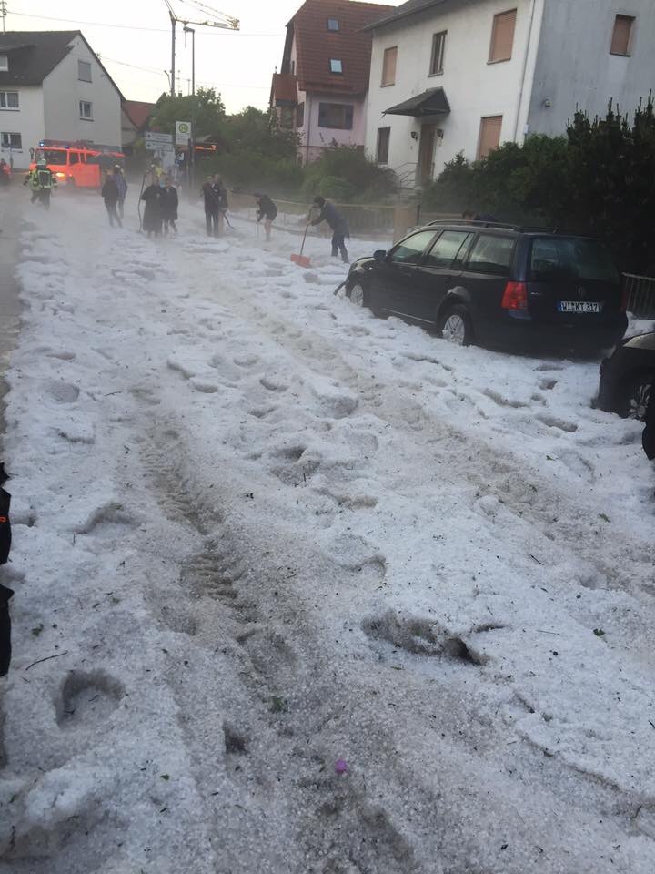 Das Gewitter zog über Teile der Innenstadt bis nach Sonnenberg, Medenbach, Kloppenheim wo massenweise Hagel niederging. Teilweise konnten die Einheiten der Freiwilligen Feuerwehr den Ortskern wegen der Hagel-Menge nicht verlassen, mussten sich den Weg freischaufeln!