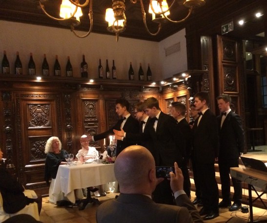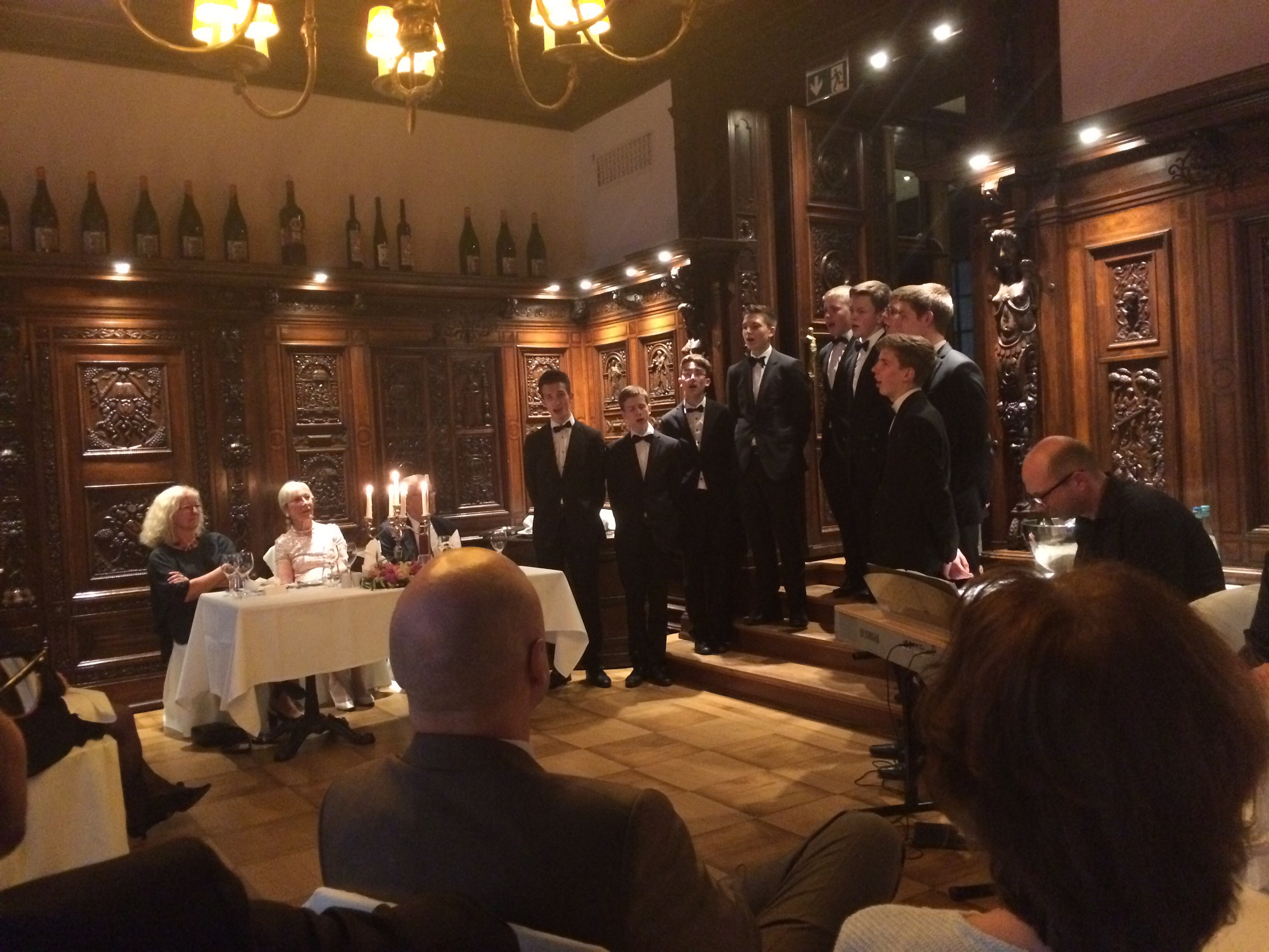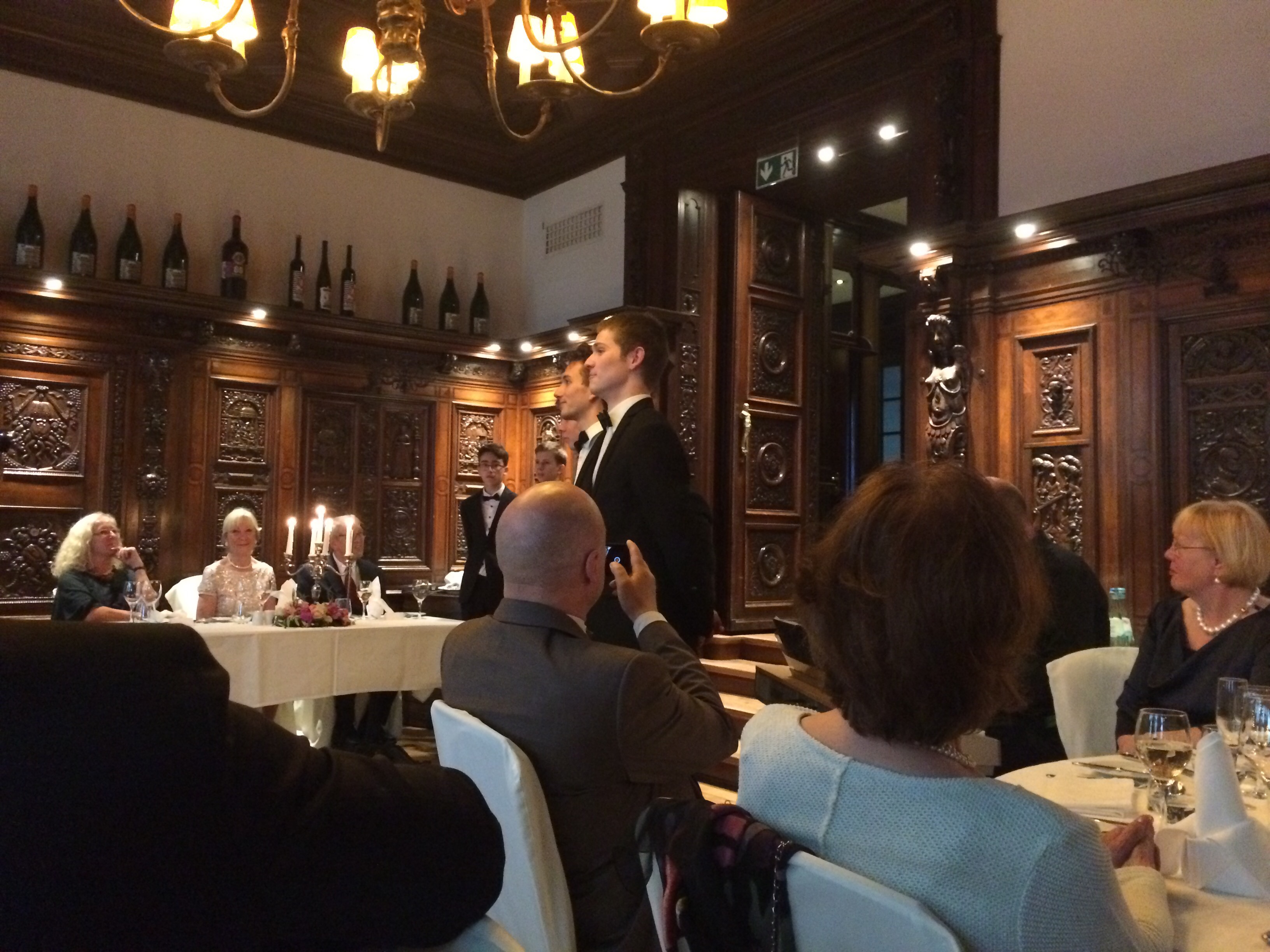 Wiesbaden, 2. Juli 2016 – Die Prinzessin Elisabeth Gesellschaft e.V. mit Sitz in Wiesbaden kümmert sich um den Erhalt der Dorfkirche in Paretz/Havelland. Jetzt gab es zum 13. Benefizessen der Gesellschaft eine schöne Überraschung: Im historischen „Ingelheimer Zimmer“ im Hotel Schwarzer Bock sang der Chor der Dilthey-Schule witzig-verschmitzt mit Elan und fröhlicher Choreografie „Ich hab‘ das Fräul’n Helen baden sehn, das war schön“ und „In der Bar zum Krokodil“ über „Die Frau von Portifar, die ungemein erfahren war, in allen Liebessachen“. Auch die „Capri-Fischer“ wurden mit vollem Körpereinsatz dargestellt und Liebesschwüre – wie es sich für ein alt- und neusprachliches Gymnasium gehört, auch in Altgriechisch, Latein und Hessisch gesungen. Dann düste der Chor weiter, musste den Bus nach Italien erreichen – Chor-Reise nach Viareggio, begleitet vom herzlichen Applaus der Benefizabend-Gäste. Das war schön. – Wie Dilthey-Sänger schon mal bei anderer Gelegenheit den Bundespräsidenten begeisterten, sehen Sie hier – klick.