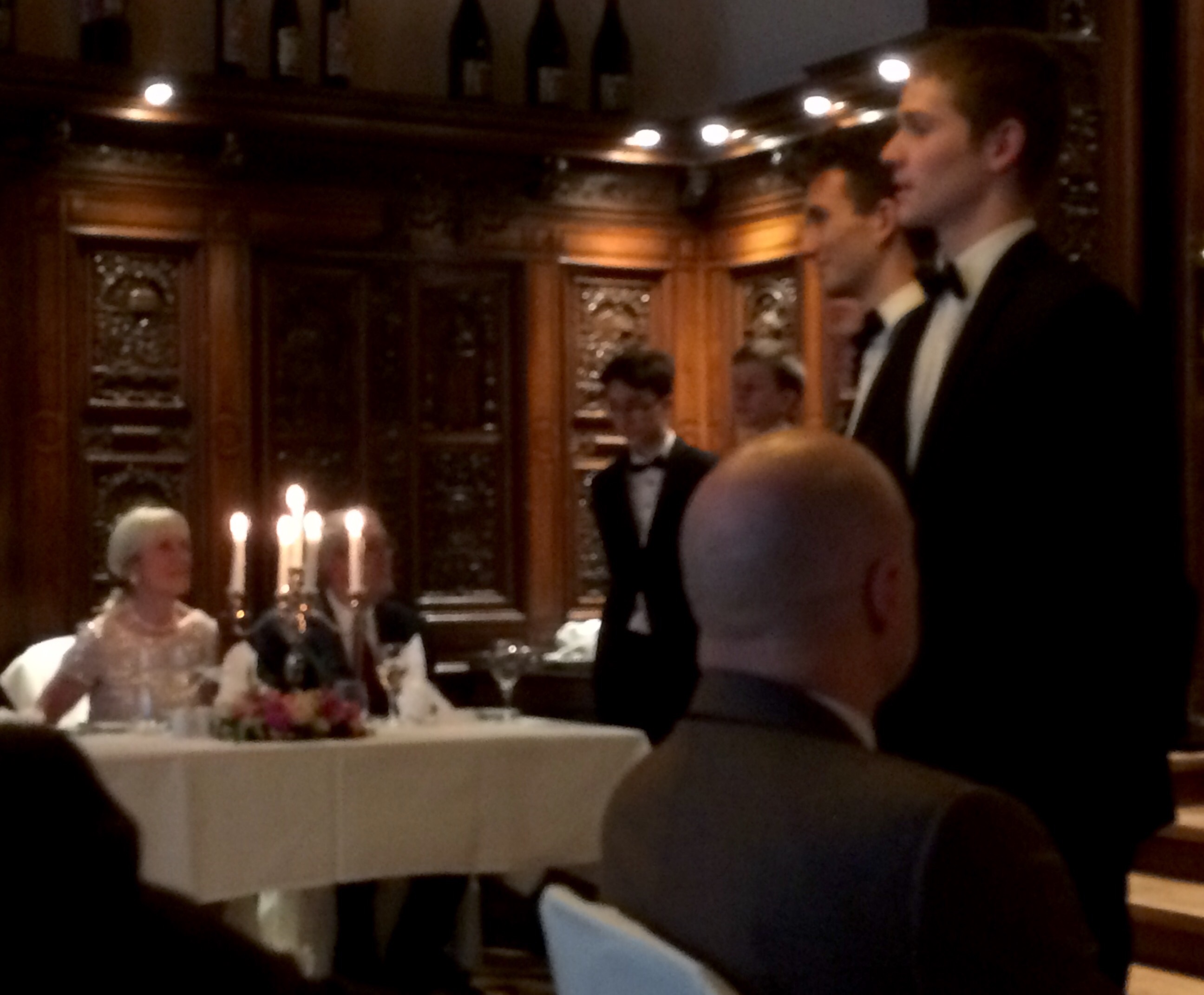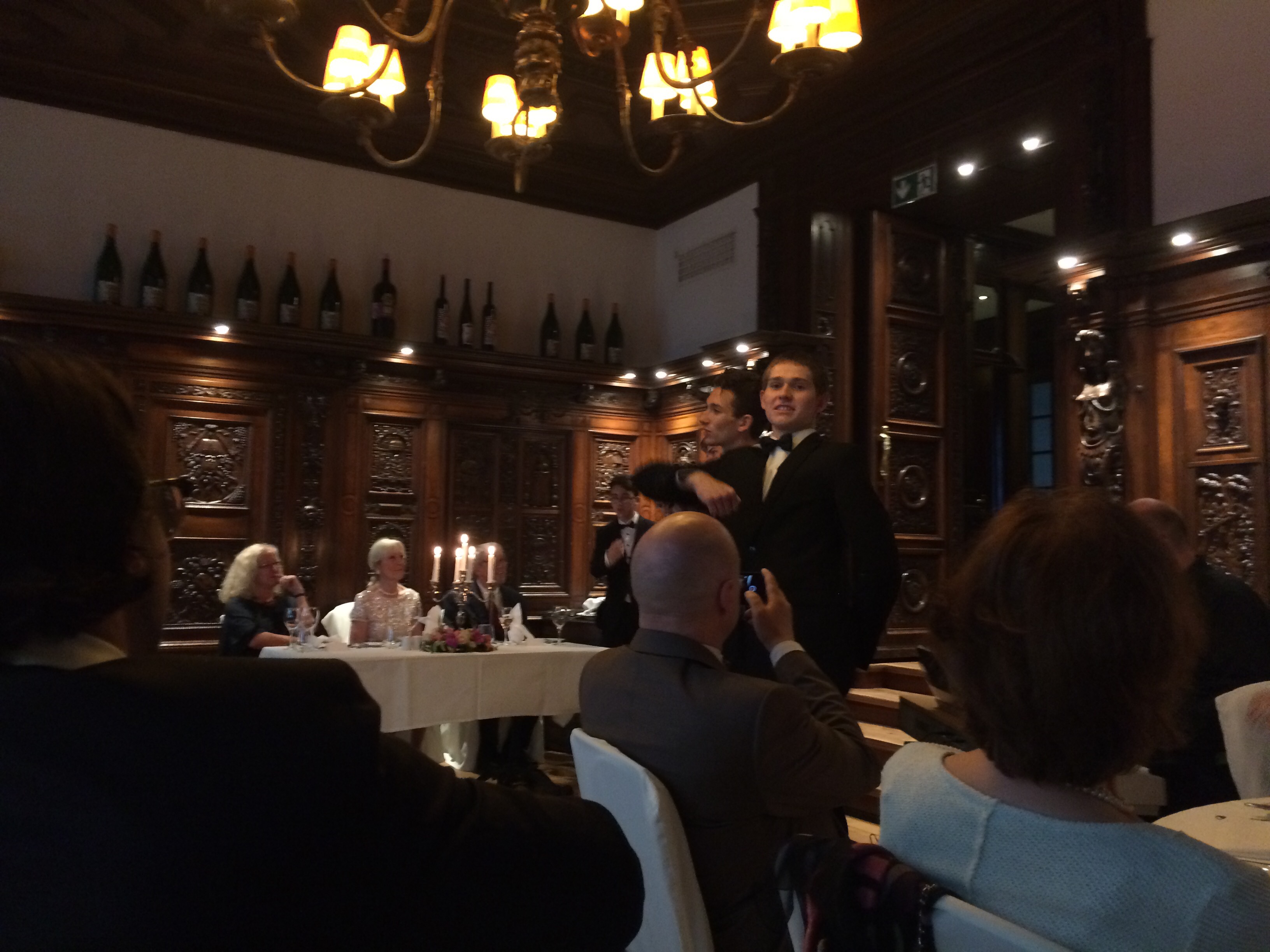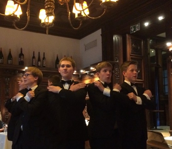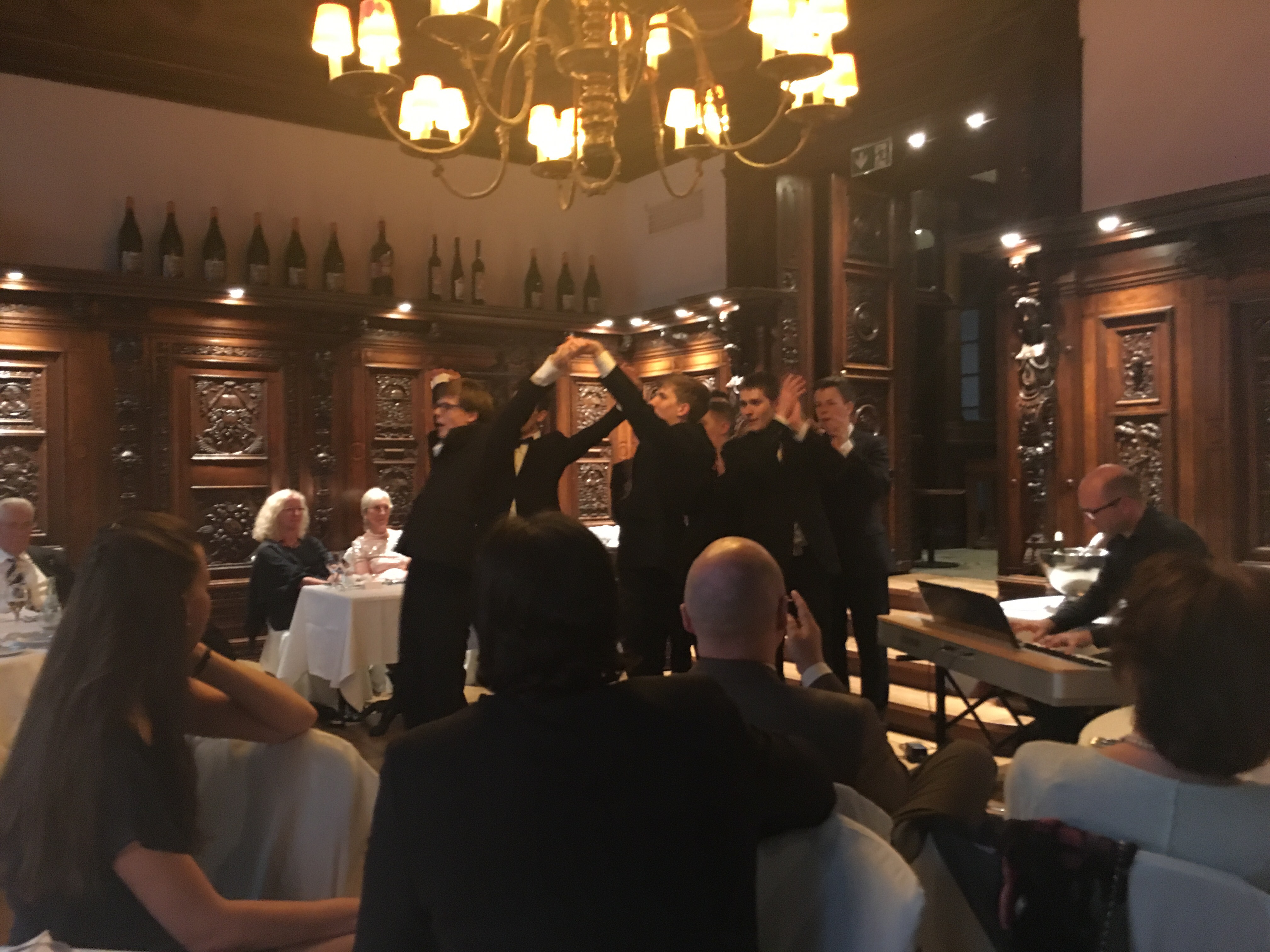 Wiesbaden, 2. Juli 2016 – Die Prinzessin Elisabeth Gesellschaft e.V. mit Sitz in Wiesbaden kümmert sich um den Erhalt der Dorfkirche in Paretz/Havelland. Jetzt gab es zum 13. Benefizessen der Gesellschaft eine schöne Überraschung: Im historischen „Ingelheimer Zimmer“ im Hotel Schwarzer Bock sang der Chor der Dilthey-Schule witzig-verschmitzt mit Elan und fröhlicher Choreografie „Ich hab‘ das Fräul’n Helen baden sehn, das war schön“ und „In der Bar zum Krokodil“ über „Die Frau von Portifar, die ungemein erfahren war, in allen Liebessachen“. Auch die „Capri-Fischer“ wurden mit vollem Körpereinsatz dargestellt und Liebesschwüre – wie es sich für ein alt- und neusprachliches Gymnasium gehört, auch in Altgriechisch, Latein und Hessisch gesungen. Dann düste der Chor weiter, musste den Bus nach Italien erreichen – Chor-Reise nach Viareggio, begleitet vom herzlichen Applaus der Benefizabend-Gäste. Das war schön. – Wie Dilthey-Sänger schon mal bei anderer Gelegenheit den Bundespräsidenten begeisterten, sehen Sie hier – klick.