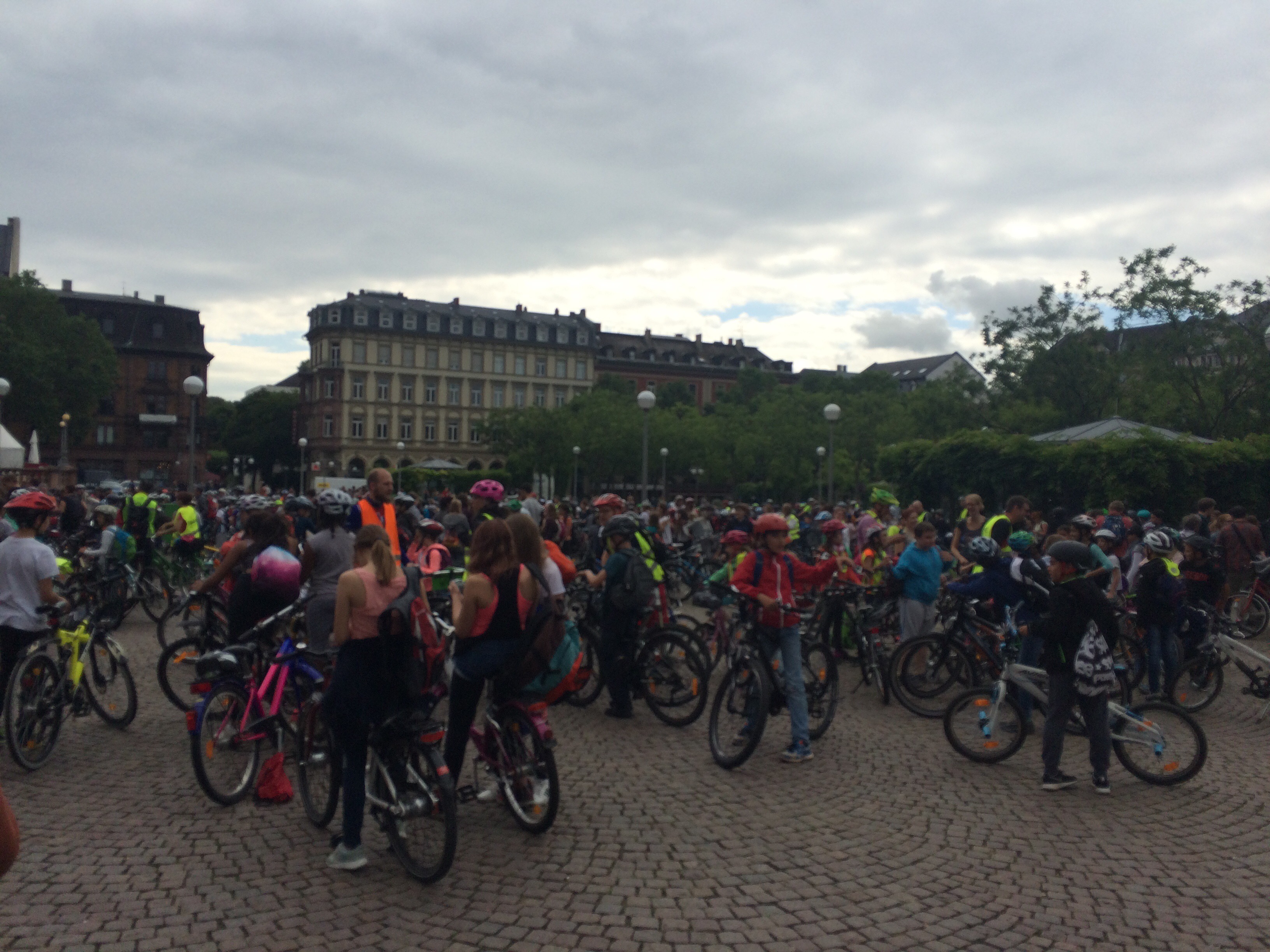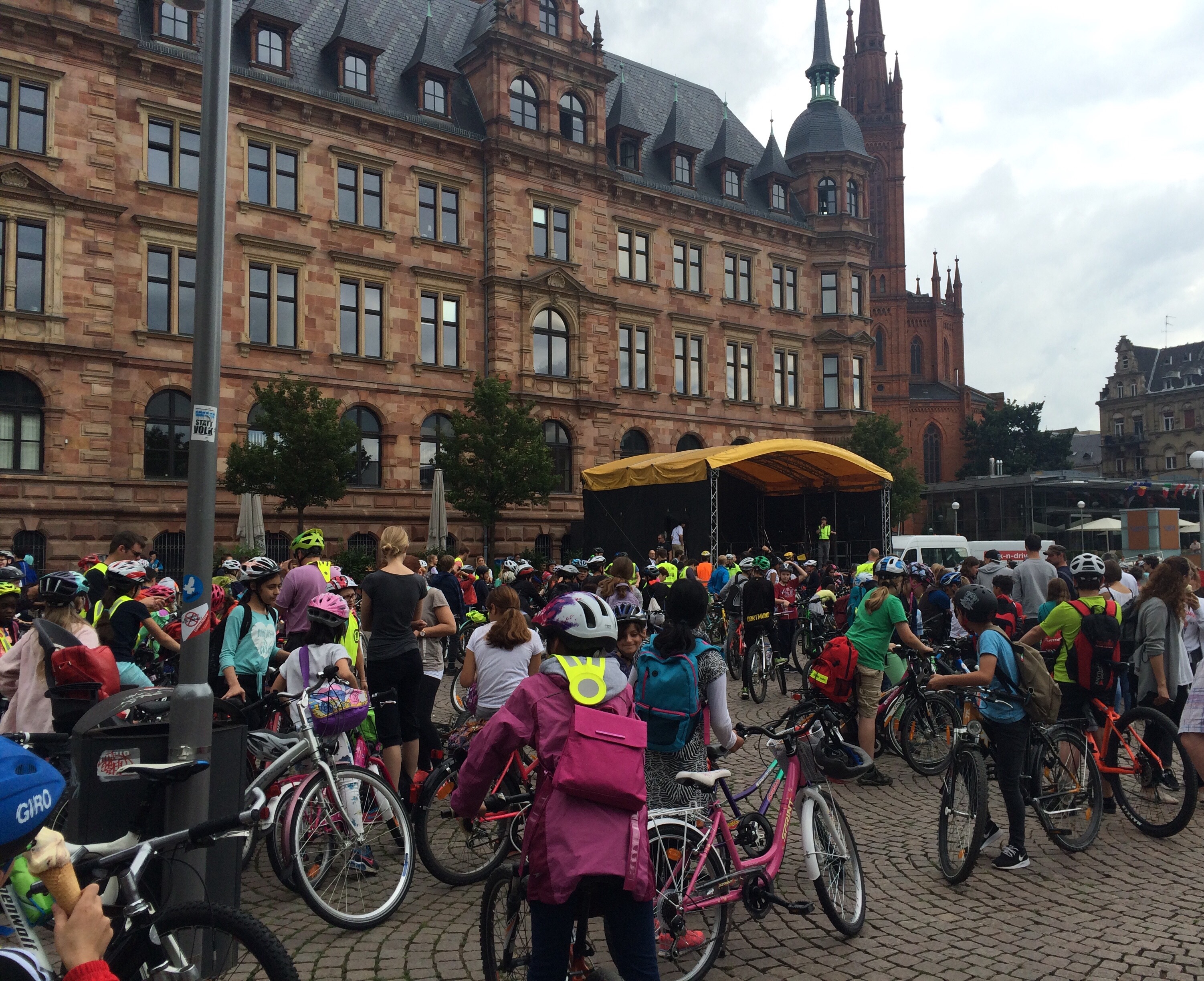 Wiesbaden, 5. Juli 2016 – Um 10 Uhr war es soweit: Der 1. Wiesbadener Schulkorso startet vom Rathaus durch die Innenstadt. Hunderte kleine Radler haben sich vor der Bühne am Dernschen Gelände versammelt, strampeln jetzt bis 13.30 Uhr mit Lehrern, Eltern und Helfern durch die City. Veranstalter ist das Bündnis Verkehrswende Wiesbaden, Motto: „Raum für’s Rad“. Oberbürgermeister Sven Gerich (SPD) und Schulderzenentin Rose-Lore Scholz (CDU) geben den Startschuss. Ein Bühnenprogramm und Wettbewerbe auf dem Dernschen Gelände sollen die Veranstaltung abrunden. Mehr Infos dazu gibt’s online hier – klick.