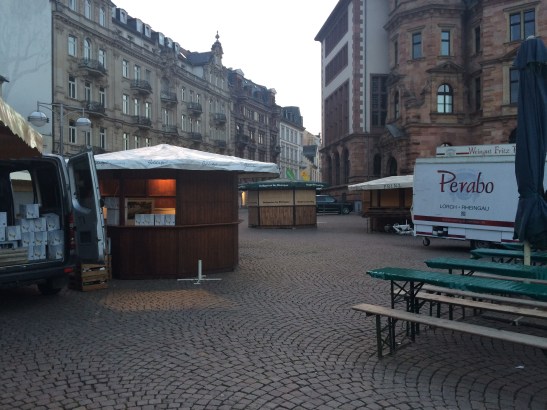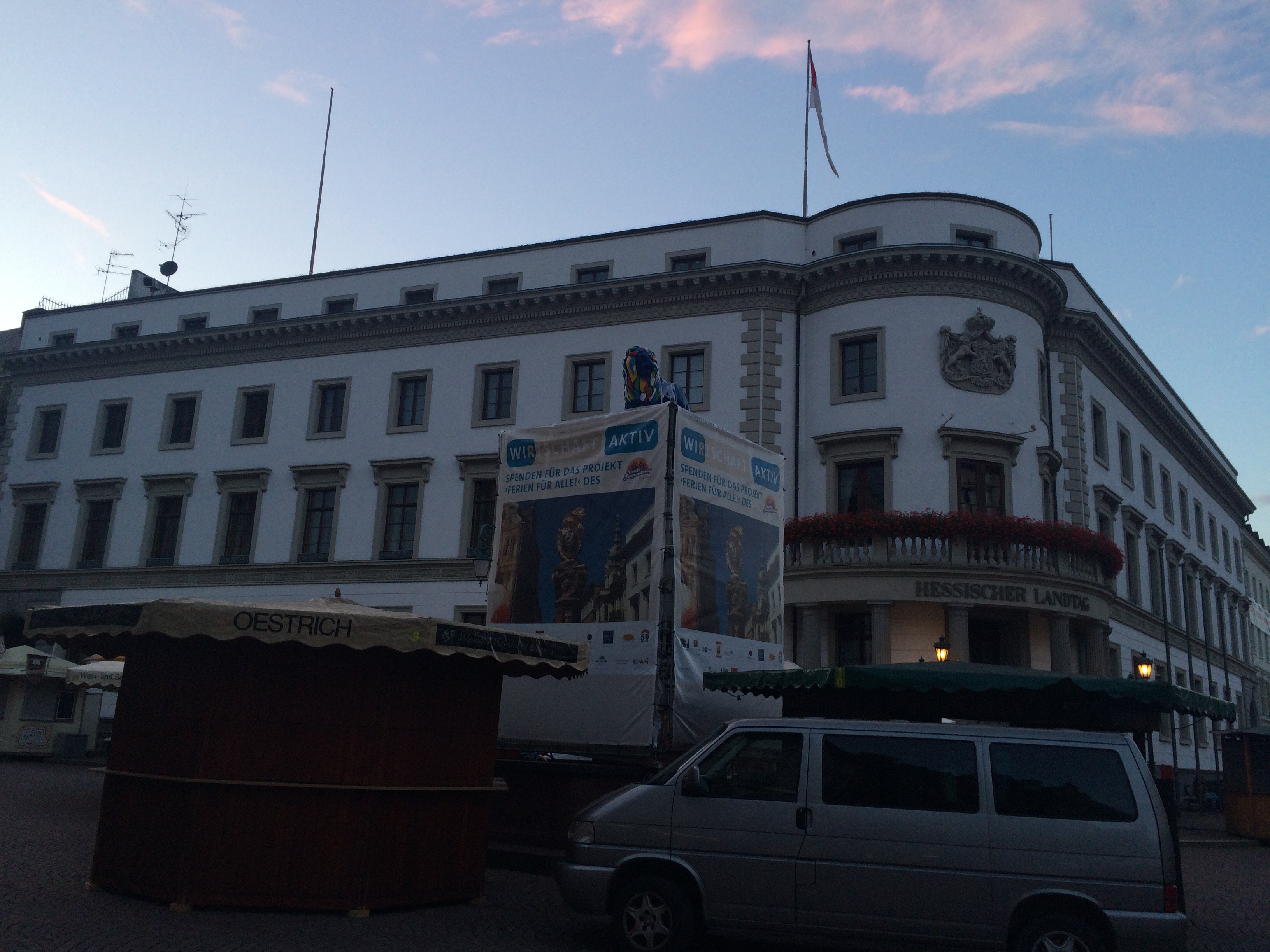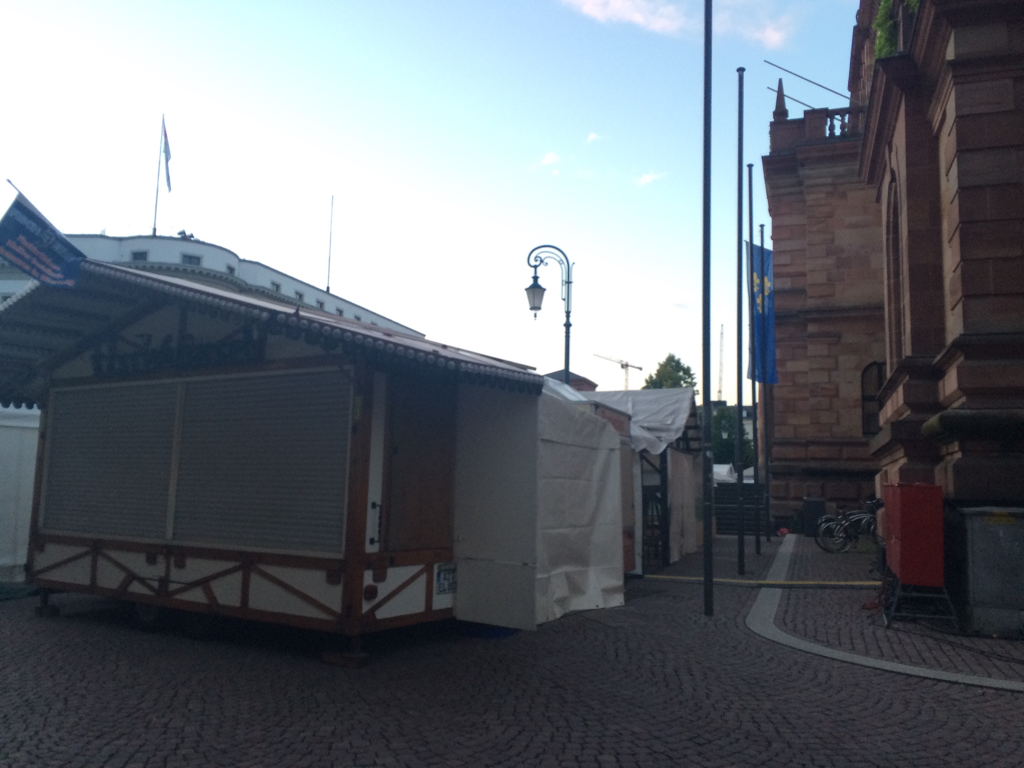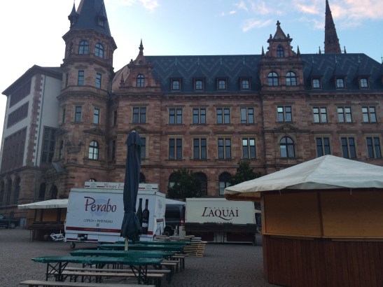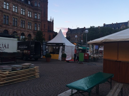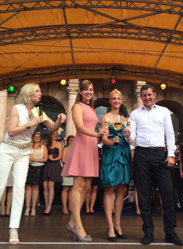 Wiesbaden, 11. August 2016 – Morgen ist es soweit: Das Weinfest, offiziell die „41. Rheingauer Weinwoche“, startet rund um den Schlossplatz mit 96 Winzern, Leckereien und Musik – und ganz schön königlich. Zur offiziellen Eröffnung um 17 Uhr ziehen wie im letzten Jahr (Archivfoto oben) auf der Bühne vor dem Rathaus die Weinköniginnen in einer Parade ein, darunter Wiesbadens Weinkönigin Stephanie Kopietz (Foto 2.v.r.) und die Rheingauer Weinkönigin Louisa Follrich. ZDF-Moderatorin Babette von Kienlin („Drehscheibe“, Foto l.) moderiert, Oberbürgermeister Sven Gerich (SPD, Foto r.) und Wirtschaftsdezernent Detlev Bendel (CDU) begrüßen. Bis 21. August darf gefeiert werden, geöffnet ist Sonntag bis Donnerstag von 11 bis 23 Uhr, Freitag und Samstag von 11 bis 24 Uhr, aber auf dem Platz vor der Marktkirche sonntags erst ab 12 Uhr. Das komplette Programm gibt’s online hier – klick. Heute heißt es aber für die Standbetreiber nochmal kräftig anpacken, auch gestern abend waren sie wieder fleißig und ließen teilweise ordentlich die Funken fliegen: