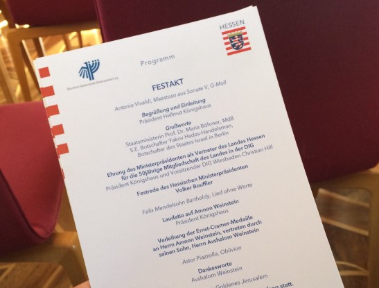 Es folgte die Verleihung der Ernst-Cramer-Medaille: Vor zwei Jahren erhielt sie Shimon Peres für sein Lebenswerk, jetzt wurde sie an Amnon Weinstein verliehen, der Violinen ehemaliger KZ-Häftlinge bewahrt und mit seinem Projekt Violins of Hope (Infos online hier – klick) weltweit Beachtung findet. Königshaus: „In dem die früheren Besitzer der Violinen durch das Spielen auf den Instrumenten unvergessen bleiben, hat Amnon Weinstein ihnen ein Denkmal gesetzt. Er erforscht die Historie der Besitzer und ist in großartiger Bewahrer der deutschen und israelischen Geschichte“.