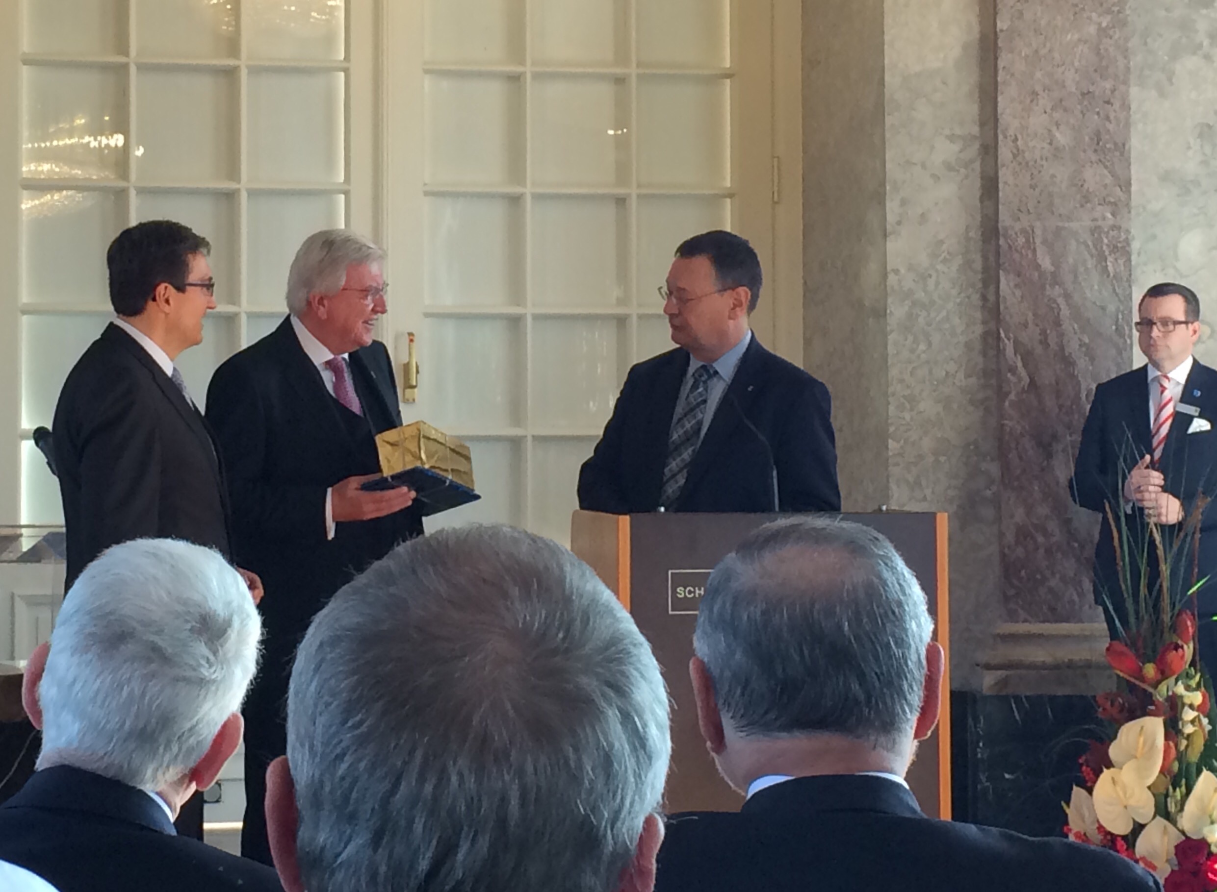 Im Anschluss erhielt Ministerpräsident Volker Bouffier (Foto M.) als Vertreter des Landes Hessen aus den Händen von Hellmut Königshaus (r.) und Christian Hill (l.), dem Vorsitzenden der DIG Wiesbaden, eine Ehrung für die 50jährige Mitgliedschaft des Landes in der DIG. Bouffier: „Hier in diesem Biebricher Schloss machen wir Veranstaltungen, die uns besonders wichtig sind. Es war uns eine besondere Freude, als die Anfrage kam, ob der Festakt hier in Hessen stattfinden kann. Das ist für uns eine Ehre und eine Auszeichnung. Es ist ein Tag der Freude, wenn wir bedenken, dass heute Israelis sagen, die Deutschen sind unsere besten Partner und Freunde. Das hätte sich vor 50 Jahren niemand träumen lassen“. Bouffier lobte den DIG-Ehrenpräsidenten Johannes Gerster als Mann von Mut und Klarheit:“Er hat mir Einsichten vermittelt, für die ich ganz besonders dankbar bin.“ Die DIG habe viel geleistet: „In Bund, Ländern, Kommunen, Begegnungen der Menschen zu begleiten ist die Aufgabe der DIG und wir Hessen werden daran mitwirken. Shalom – Friede sei mit Euch“.